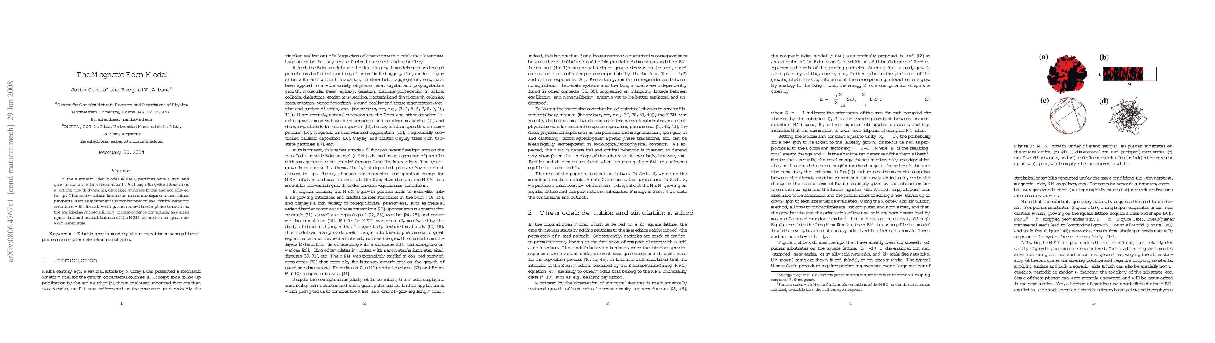 The Magnetic Eden Model reviews recent developments on particle growth in a thermal bath with frozen spins, exploring phenomena like critical behavior and phase transitions. It also touches on its correspondence to equilibrium and nonequilibrium systems and its application to complex network substrates.