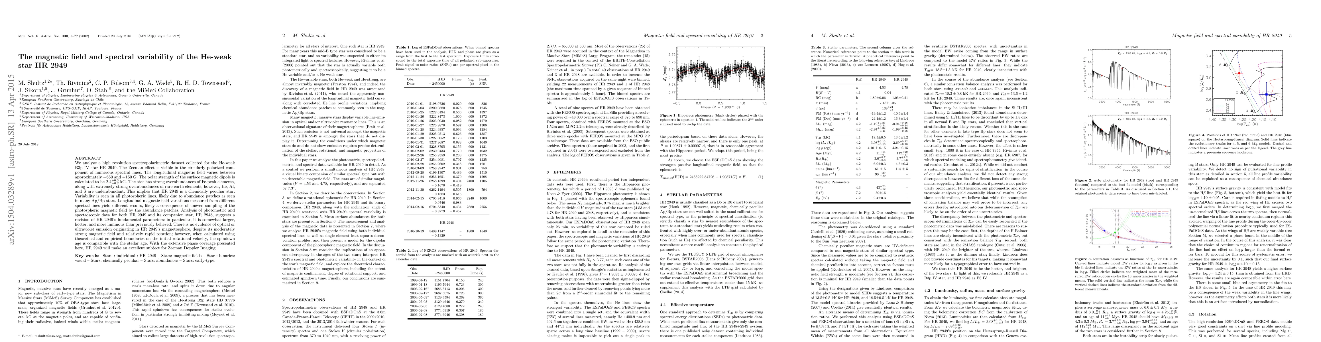 We analyze a high resolution spectropolarimetric dataset collected for the He-weak B3p IV star HR 2949. The Zeeman effect is visible in the circularly polarized component of numerous spectral lines. The longitudinal magnetic field varies between approximately $-650$ and $+150$ G. The polar strength of the surface magnetic dipole is calculated to be 2.4$^{+0.3}_{-0.2}$ kG. The star has strong overabundances of Fe-peak elements, along with extremely strong overabundances of rare-earth elements; however, He, Al, and S are underabundant. This implies that HR 2949 is a chemically peculiar star. Variability is seen in all photospheric lines, likely due to abundance patches as seen in many Ap/Bp stars. Longitudinal magnetic field variations measured from different spectral lines yield different results, likely a consequence of uneven sampling of the photospheric magnetic field by the abundance patches. Analysis of photometric and spectroscopic data for both HR 2949 and its companion star, HR 2948, suggests a revision of HR 2949's fundamental parameters: in particular, it is somewhat larger, hotter, and more luminous than previously believed. There is no evidence of optical or ultraviolet emission originating in HR 2949's magnetosphere, despite its moderately strong magnetic field and relatively rapid rotation; however, when calculated using theoretical and empirical boundaries on the initial rotational velocity, the spindown age is compatible with the stellar age. With the extensive phase coverage presented here, HR 2949 will make an excellent subject for Zeeman Doppler Imaging.