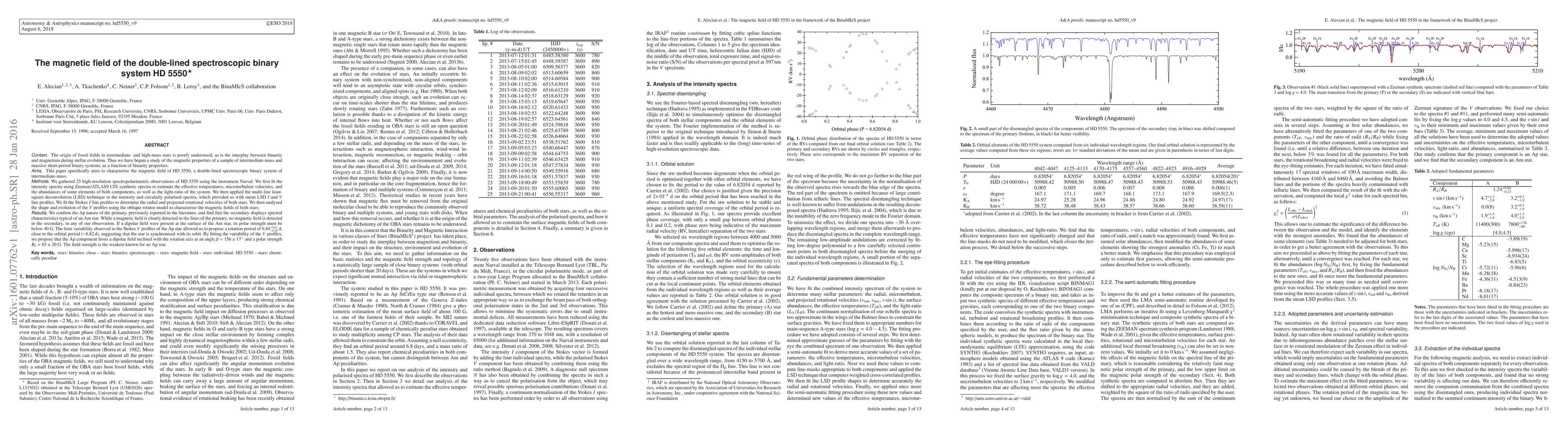 The research characterizes the magnetic field of the double-lined spectroscopic binary system HD 5550. Using high-resolution spectropolarimetric observations, it confirms the Ap nature of the primary star and identifies the secondary as an Am star. A magnetic field is detected in the primary but not in the secondary, suggesting a dipolar field strength of about 65 G for the Ap star, one of the weakest known. The primary's rotation period is proposed to be synchronized with its orbital period.