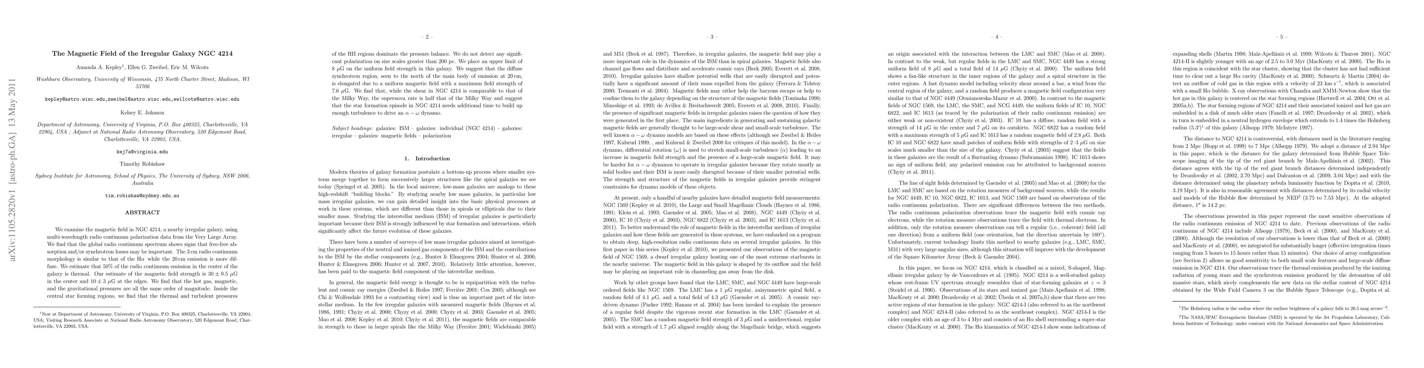 We examine the magnetic field in NGC 4214, a nearby irregular galaxy, using multi-wavelength radio continuum polarization data from the Very Large Array. We find that the global radio continuum spectrum shows signs that free-free absorption and/or synchrotron losses may be important. The 3cm radio continuum morphology is similar to that of the Halpha, while the 20cm emission is more diffuse. We estimate that 50% of the radio continuum emission in the center of the galaxy is thermal. Our estimate of the magnetic field strength is $30\pm 9.5$ \uG\ in the center and $10\pm3$ \uG\ at the edges. We find that the hot gas, magnetic, and the gravitational pressures are all the same order of magnitude. Inside the central star forming regions, we find that the thermal and turbulent pressures of the HII regions dominate the pressure balance. We do not detect any significant polarization on size scales greater than 200 pc. We place an upper limit of 8 \uG\ on the uniform field strength in this galaxy. We suggest that the diffuse synchrotron region, seen to the north of the main body of emission at 20cm, is elongated due to a uniform magnetic field with a maximum field strength of 7.6 \uG. We find that, while the shear in NGC 4214 is comparable to that of the Milky Way, the supernova rate is half that of the Milky Way and suggest that the star formation episode in NGC 4214 needs additional time to build up enough turbulence to drive an $\alpha-\omega$ dynamo.