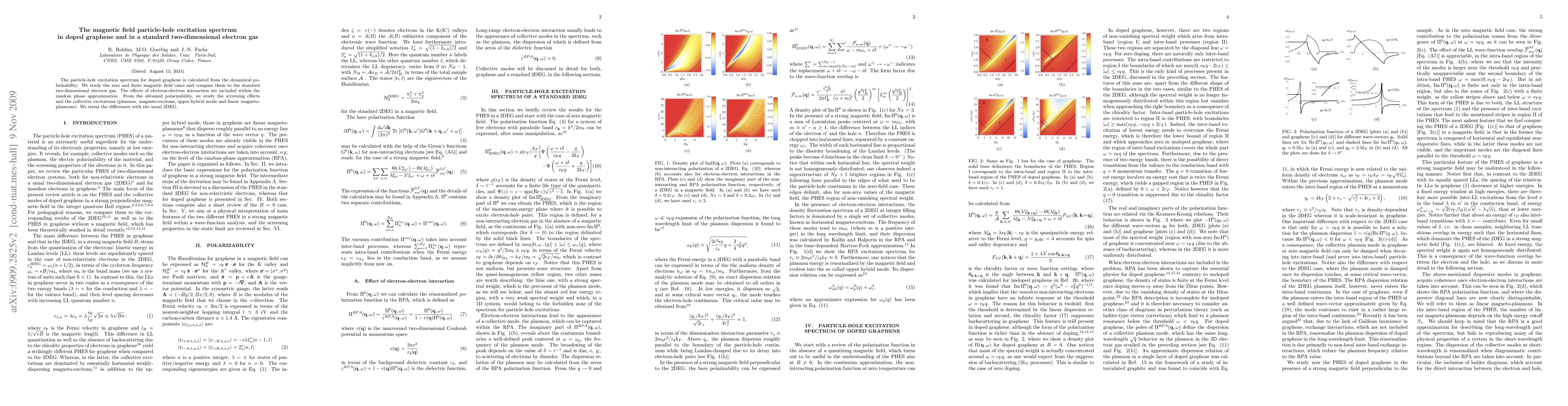 This paper calculates the particle-hole excitation spectrum in doped graphene under magnetic fields, comparing it to the standard two-dimensional electron gas (2DEG). It highlights the differences in screening effects and collective excitations, including plasmons and magneto-excitons, considering electron-electron interactions via the random phase approximation.