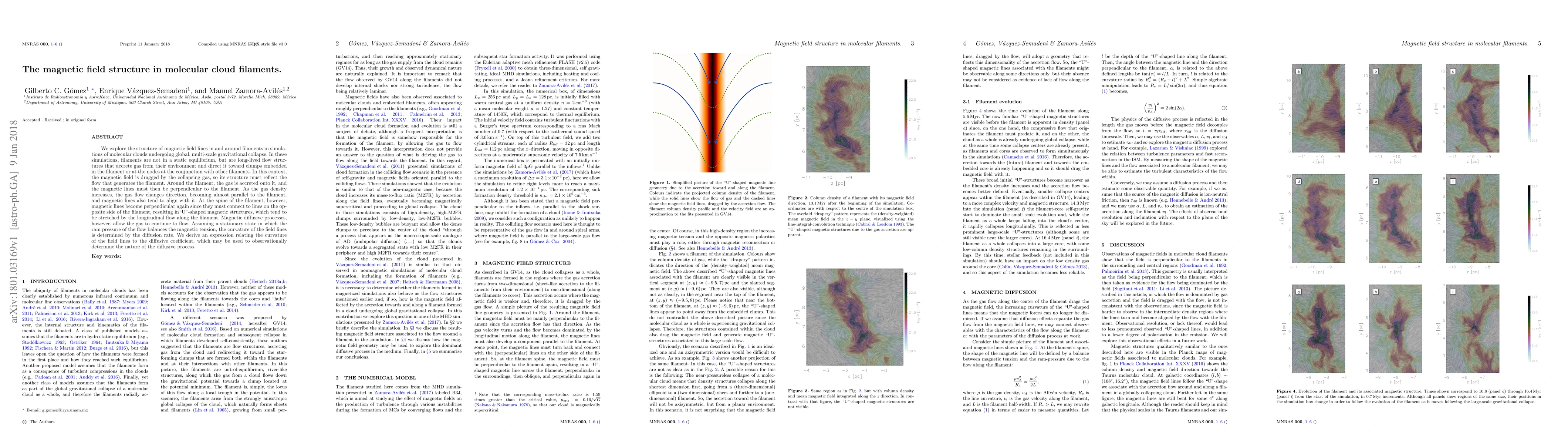 Researchers studied magnetic field structures in molecular cloud filaments, finding that they form U-shaped fields with curvature determined by a diffusion rate, reflecting the dynamic flow of gas within the filaments.