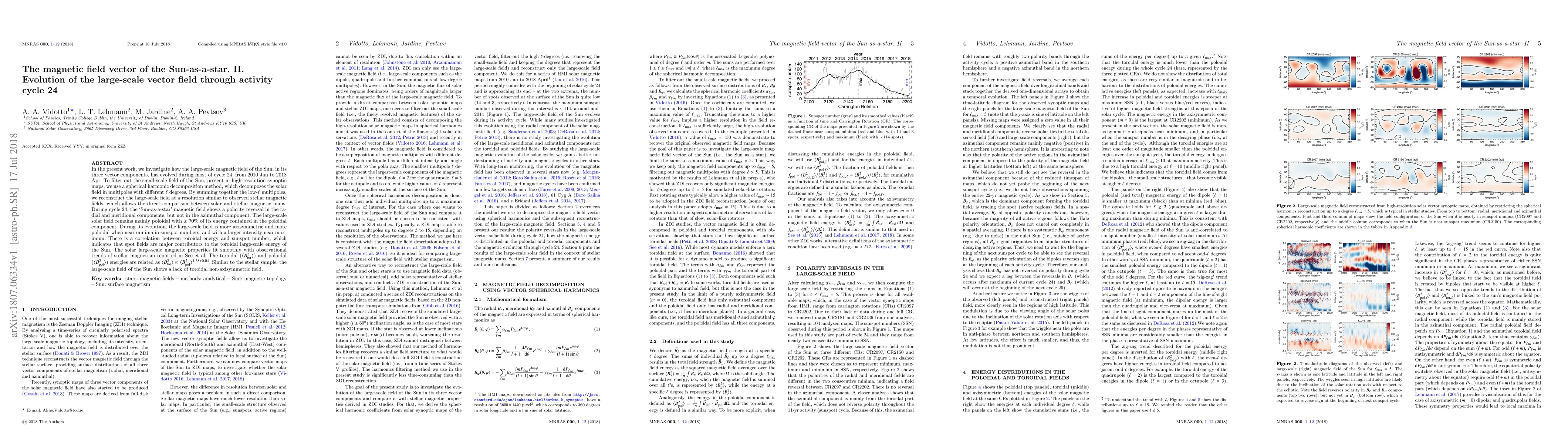 This paper investigates the evolution of the Sun's large-scale magnetic field during cycle 24, revealing a polarity reversal in radial and meridional components but not in the azimuthal component. The large-scale field remains predominantly poloidal, with a correlation between toroidal energy and sunspot numbers, indicating that sunspot fields significantly contribute to the toroidal energy.