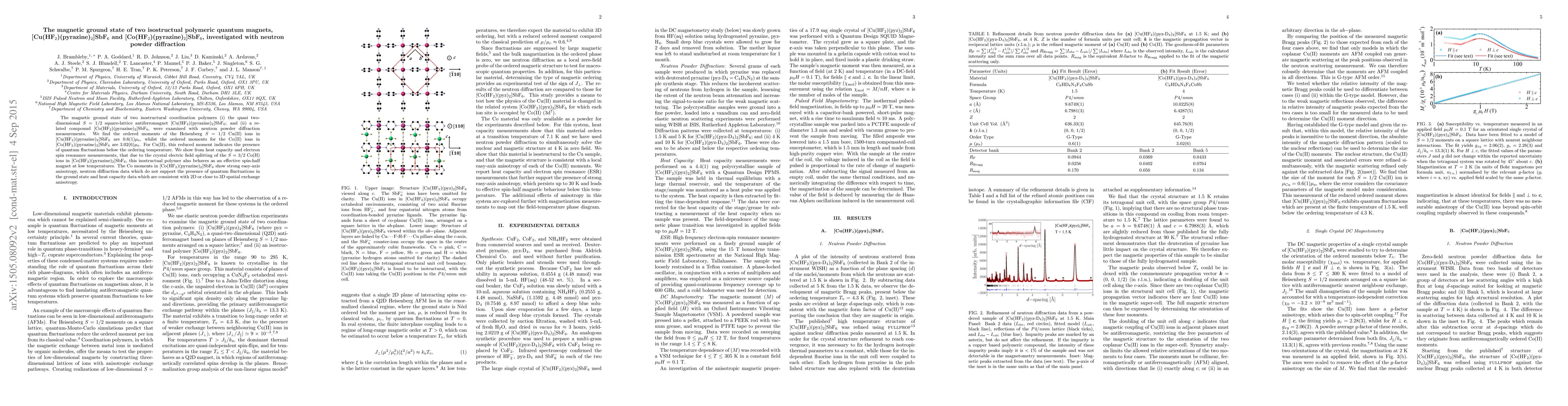The magnetic ground state of two isostructural coordination polymers (i) the quasi two-dimensional S = 1/2 square-lattice antiferromagnet [Cu(HF$_{2}$)(pyrazine)$_{2}$]SbF$_{6}$; and (ii) a new compound [Co(HF$_{2}$)(pyrazine)$_{2}$]SbF$_{6}$, were examined with neutron powder diffraction measurements. We find the ordered moments of the Heisenberg S = 1/2 Cu(II) ions in [Cu(HF$_{2}$)(pyrazine)$_{2}$]SbF$_{6}$ are 0.6(1)$\mu_{B}$, whilst the ordered moments for the Co(II) ions in [Co(HF$_{2}$)(pyrazine)$_{2}$]SbF$_{6}$ are 3.02(6)$\mu_{B}$. For Cu(II), this reduced moment indicates the presence of quantum fluctuations below the ordering temperature. We show from heat capacity and electron spin resonance measurements, that due to the crystal electric field splitting of the S = 3/2 Co(II) ions in [Co(HF$_{2}$)(pyrazine)$_{2}$]SbF$_{6}$, this isostructual polymer also behaves as an effective spin-half magnet at low temperatures. The Co moments in [Co(HF$_{2}$)(pyrazine)$_{2}$]SbF$_{6}$ show strong easy-axis anisotropy, neutron diffraction data which do not support the presence of quantum fluctuations in the ground state and heat capacity data which are consistent with 2D or close to 3D spatial exchange anisotropy.