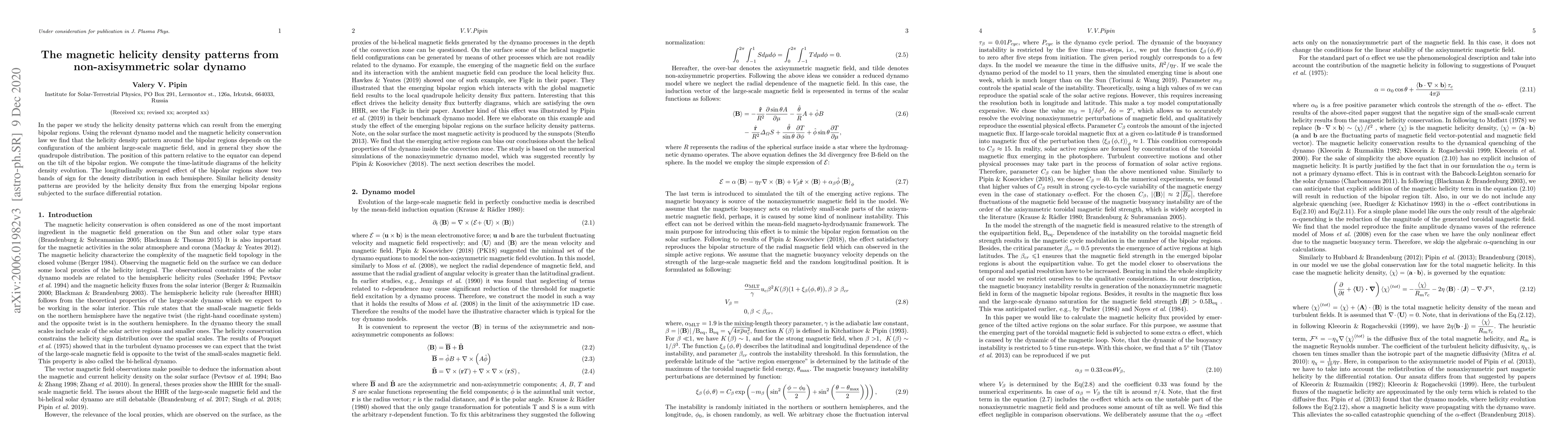 Researchers studied magnetic helicity patterns from non-axisymmetric solar dynamos, finding that emerging bipolar regions create quadrupole distributions influenced by the ambient large-scale magnetic field.