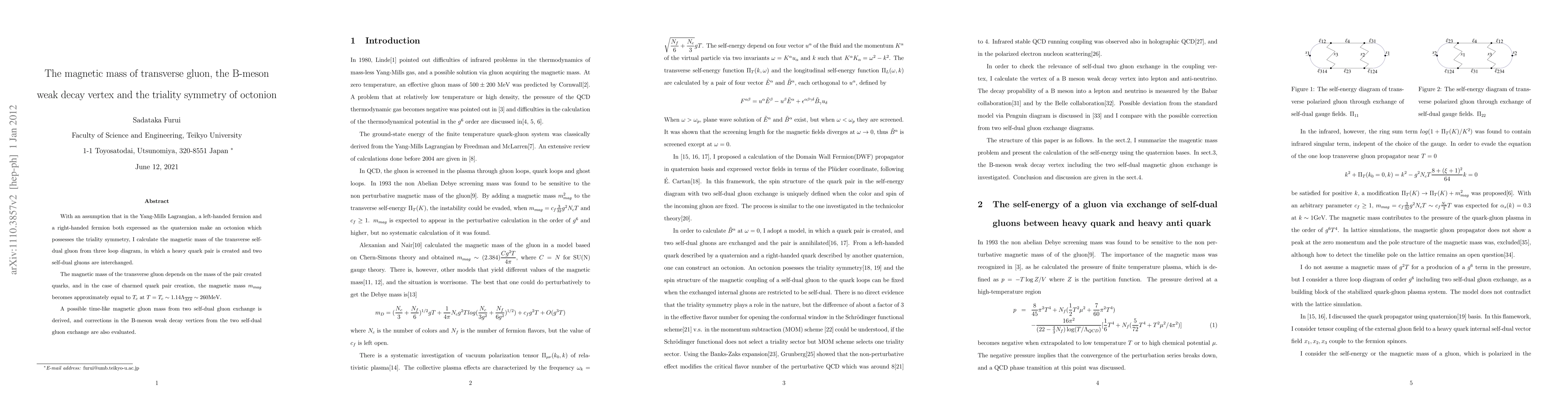 With an assumption that in the Yang-Mills Lagrangian, a left-handed fermion and a right-handed fermion both expressed as quaternion make an octonion which possesses the triality symmetry, I calculate the magnetic mass of the transverse self-dual gluon from three loop diagram, in which a heavy quark pair is created and two self-dual gluons are interchanged. The magnetic mass of the transverse gluon depends on the mass of the pair created quarks, and in the case of charmed quark pair creation, the magnetic mass $m_{mag}$ becomes approximately equal to $T_c$ at $T=T_c\sim 1.14\Lambda_{\bar{MS}}\sim 260$MeV. A possible time-like magnetic gluon mass from two self-dual gluon exchange is derived, and corrections in the B-meson weak decay vertices from the two self-dual gluon exchange are also evaluated.