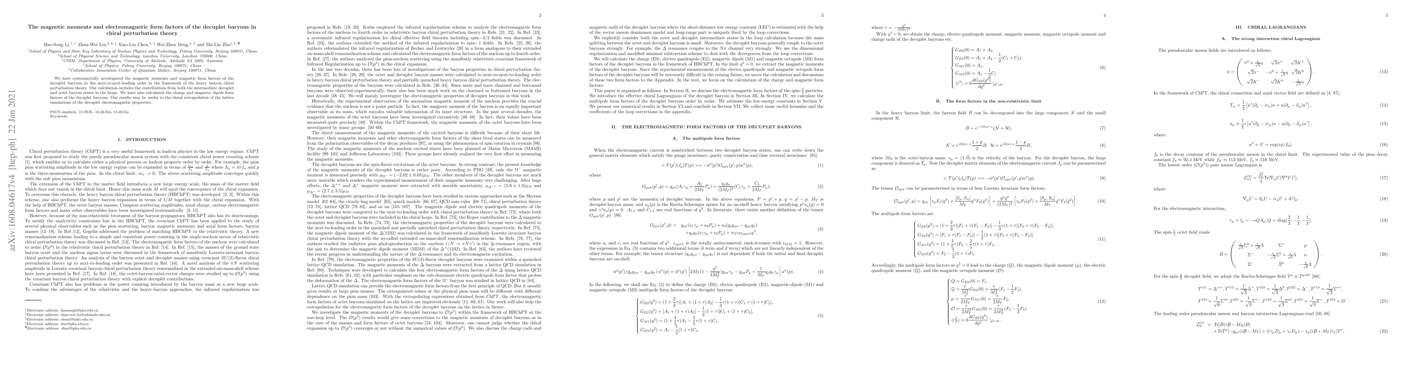 This paper systematically investigates the magnetic moments and electromagnetic form factors of decuplet baryons to next-to-next-leading order in heavy baryon chiral perturbation theory, incorporating contributions from both decuplet and octet baryon states. The results provide valuable data for chiral extrapolation of lattice simulations of the electromagnetic properties of decuplet baryons.