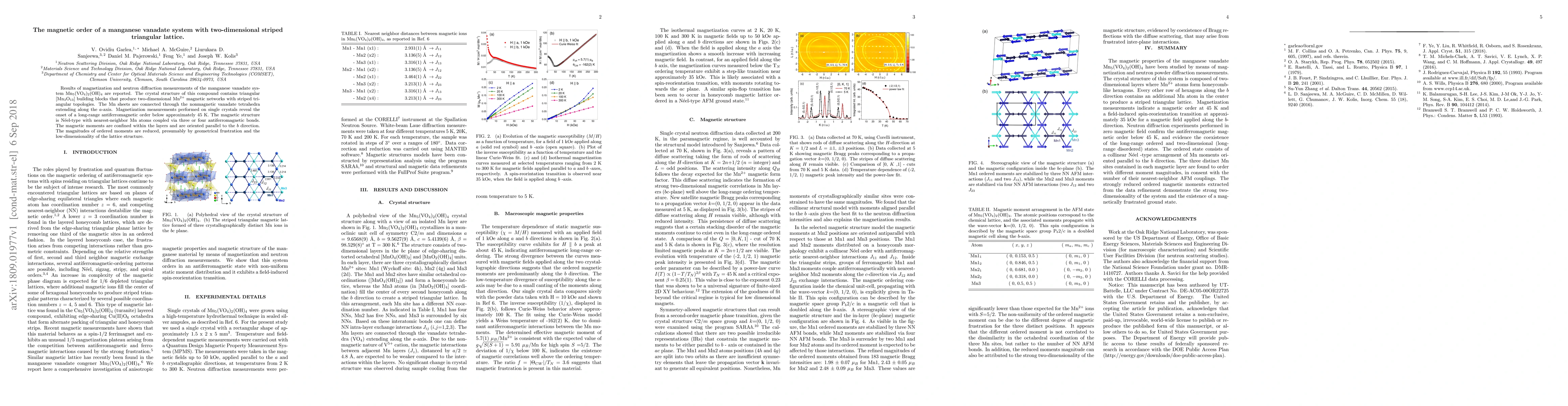 Researchers discover a new manganese vanadate compound with a two-dimensional striped triangular lattice that exhibits long-range antiferromagnetic order below 45 K, featuring Néel-type magnetic structure and frustrated moments.