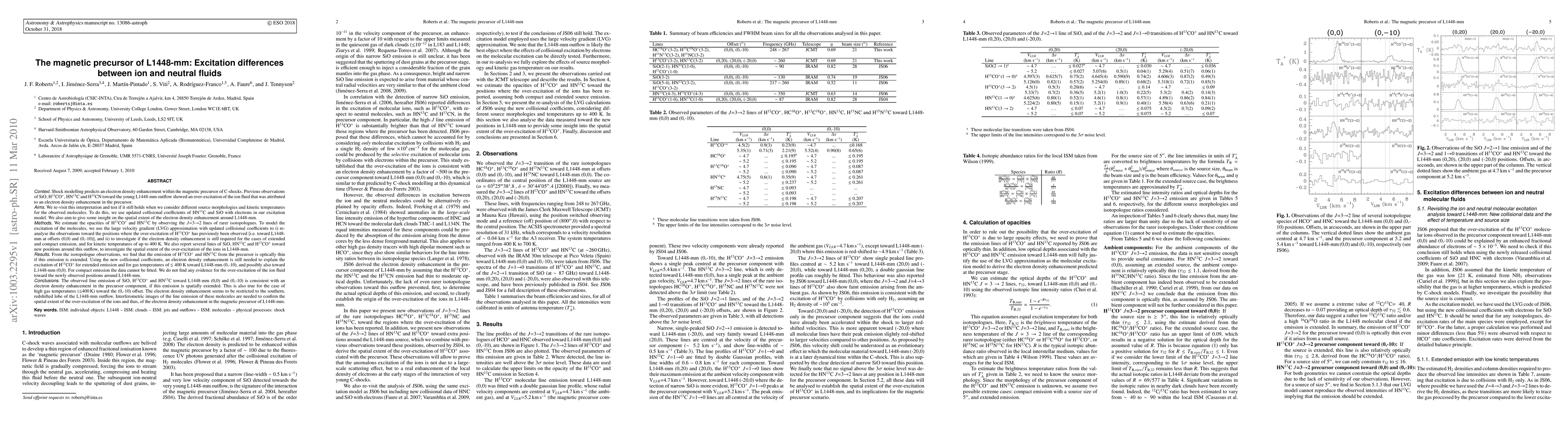 This paper investigates the magnetic precursor of L1448-mm, finding that electron density enhancement is required to explain the over-excitation of H13CO+ for extended emission and temperatures up to 400 K, but not for compact emission. The over-excitation is localized to the southern, redshifted lobe of the outflow.