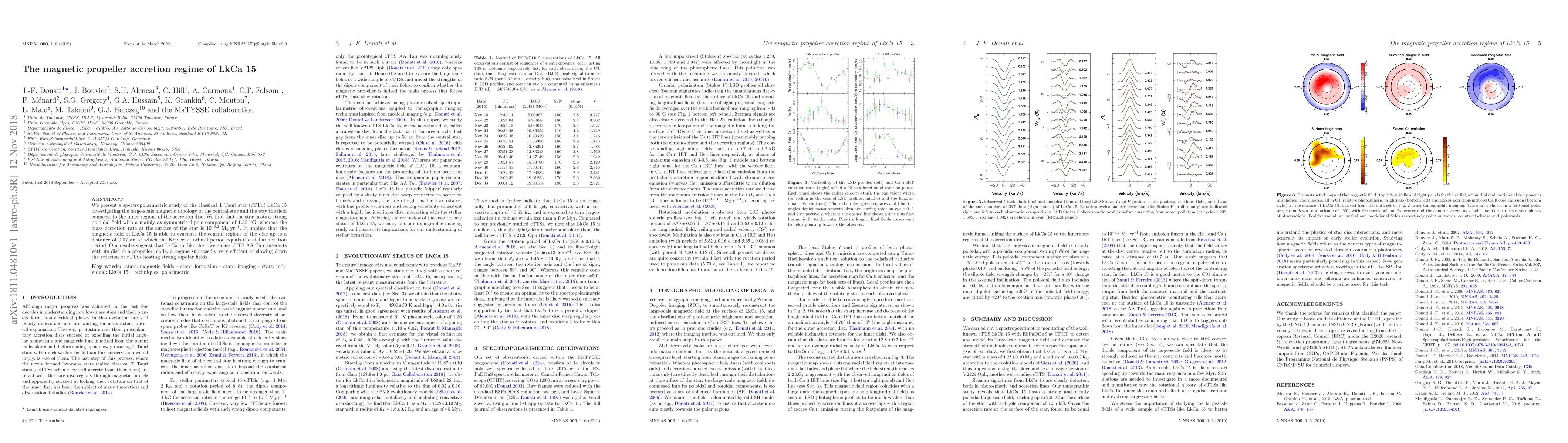 This study reveals that the T Tauri star LkCa 15 exhibits a strong poloidal magnetic field and operates in a magnetic propeller accretion regime, efficiently slowing its rotation by evacuating the inner disc regions. The mass accretion rate is low, suggesting the star's strong dipolar field effectively interacts with the disc.