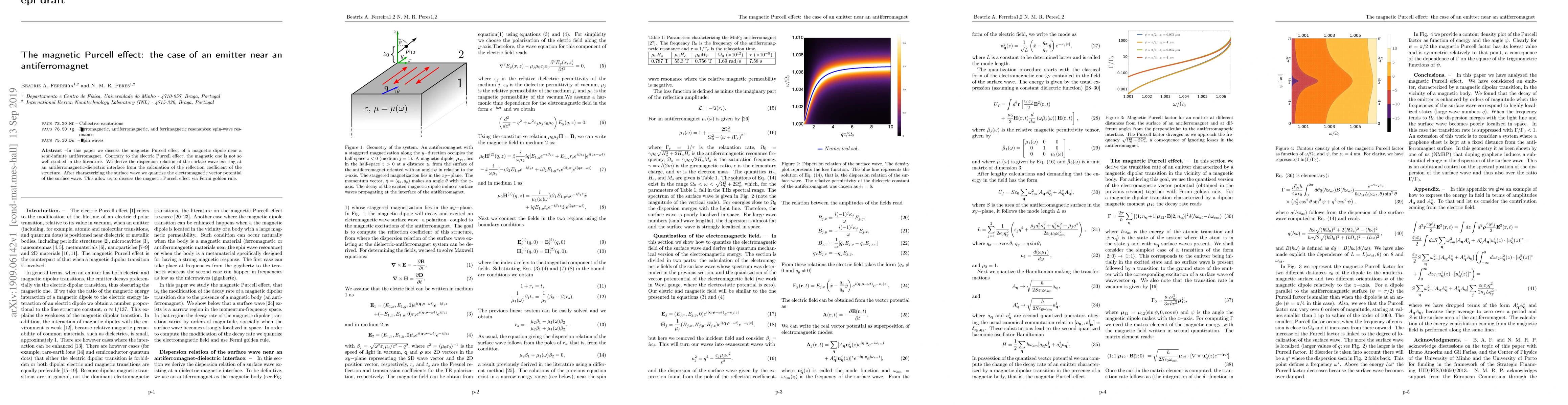 In this paper we discuss the magnetic Purcell effect of a magnetic dipole near a semi-infinite antiferromagnet. Contrary to the electric Purcell effect, the magnetic one is not so well studied in the literature. We derive the dispersion relation of the surface wave existing at an antiferromagnetic-dielectric interface from the calculation of the reflection coefficient of the structure. After characterizing the surface wave we quantize the electromagnetic vector potential of the surface wave. This allow us to discuss the magnetic Purcell effect via Fermi golden rule.