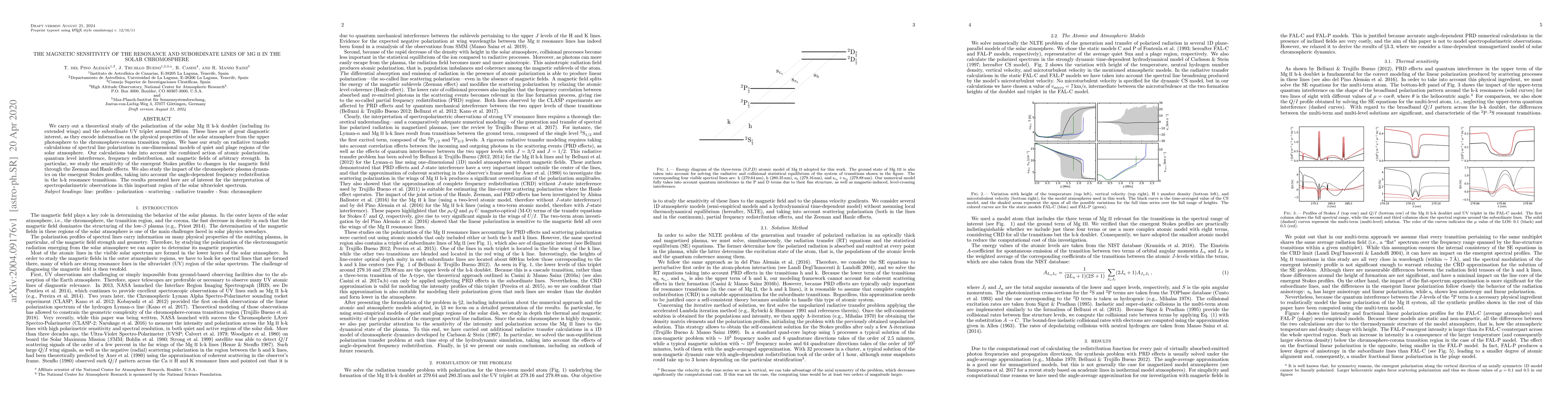 This paper investigates the polarization of solar Mg II lines, including the h-k doublet and subordinate UV triplet, using radiative transfer calculations to understand their magnetic sensitivity. The study focuses on the effects of Zeeman and Hanle effects, and the influence of chromospheric dynamics on spectral line polarization in quiet and plage regions.