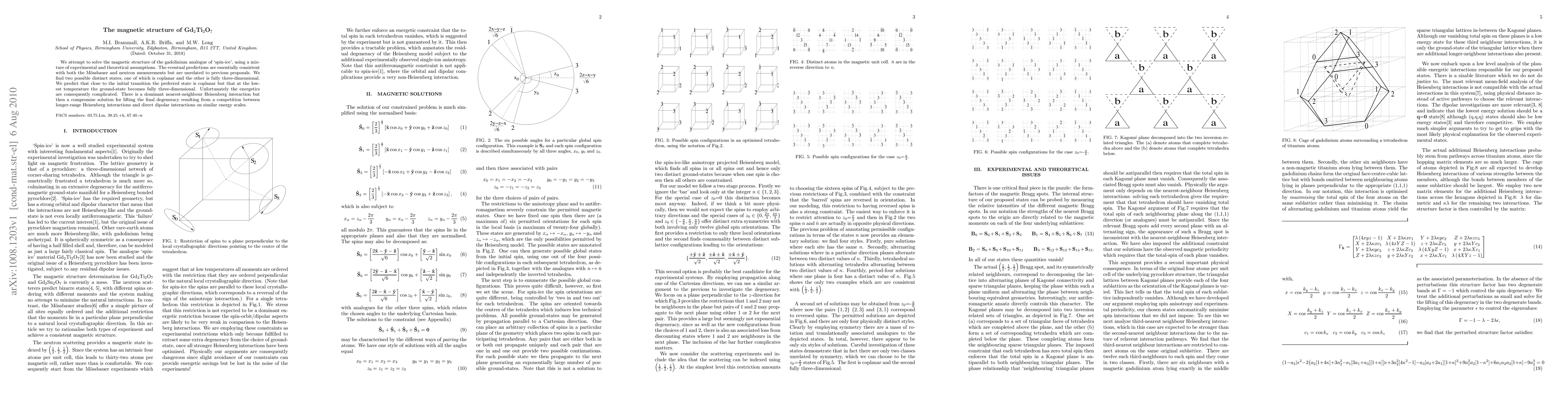 We attempt to solve the magnetic structure of the gadolinium analogue of `spin-ice', using a mixture of experimental and theoretical assumptions. The eventual predictions are essentially consistent with both the Mossbauer and neutron measurements but are unrelated to previous proposals. We find two possible distinct states, one of which is coplanar and the other is fully three-dimensional. We predict that close to the initial transition the preferred state is coplanar but that at the lowest temperature the ground-state becomes fully three-dimensional. Unfortunately the energetics are consequently complicated. There is a dominant nearest-neighbour Heisenberg interaction but then a compromise solution for lifting the final degeneracy resulting from a competition between longer-range Heisenberg interactions and direct dipolar interactions on similar energy scales.