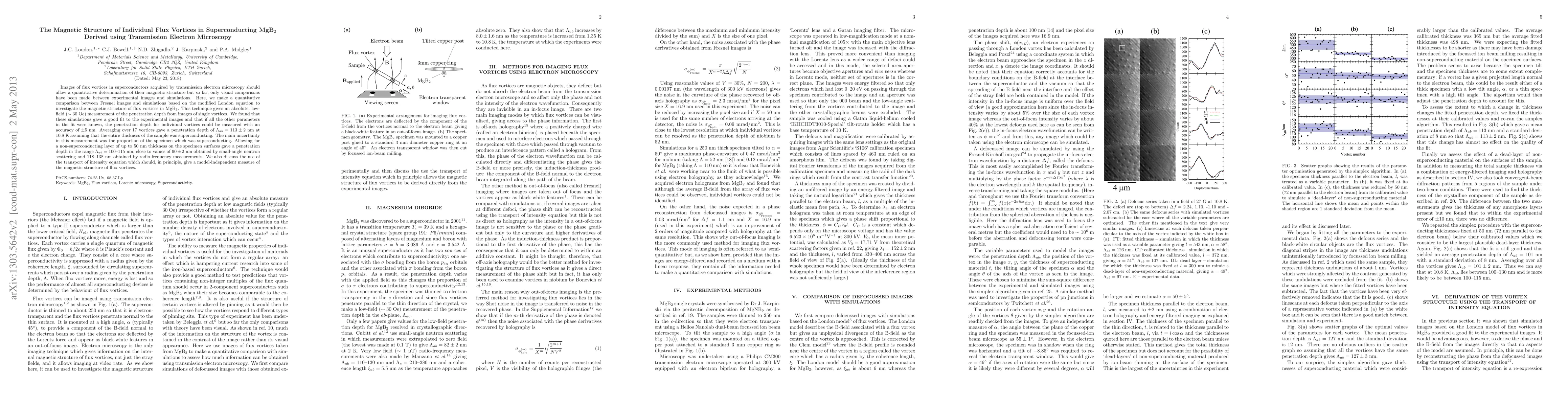 This study uses transmission electron microscopy to quantitatively determine the magnetic structure of flux vortices in MgB2 superconductors, comparing experimental Fresnel images with simulations based on the modified London equation. The results indicate a penetration depth of 113 +/- 2 nm in the ab plane at 10.8 K, with uncertainties arising from non-superconducting layers, and discuss the potential of the transport of intensity equation for model-independent measurements.