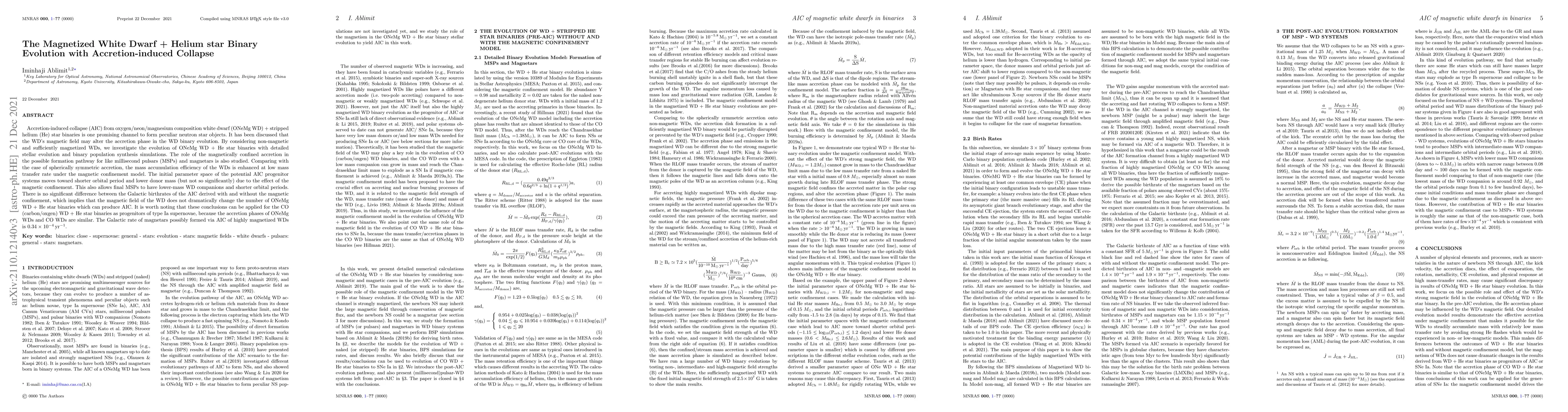 The study investigates the evolution of ONeMg WD + He star binaries using detailed stellar evolution and binary population synthesis simulations, considering both non-magnetic and magnetically confined accretion models.