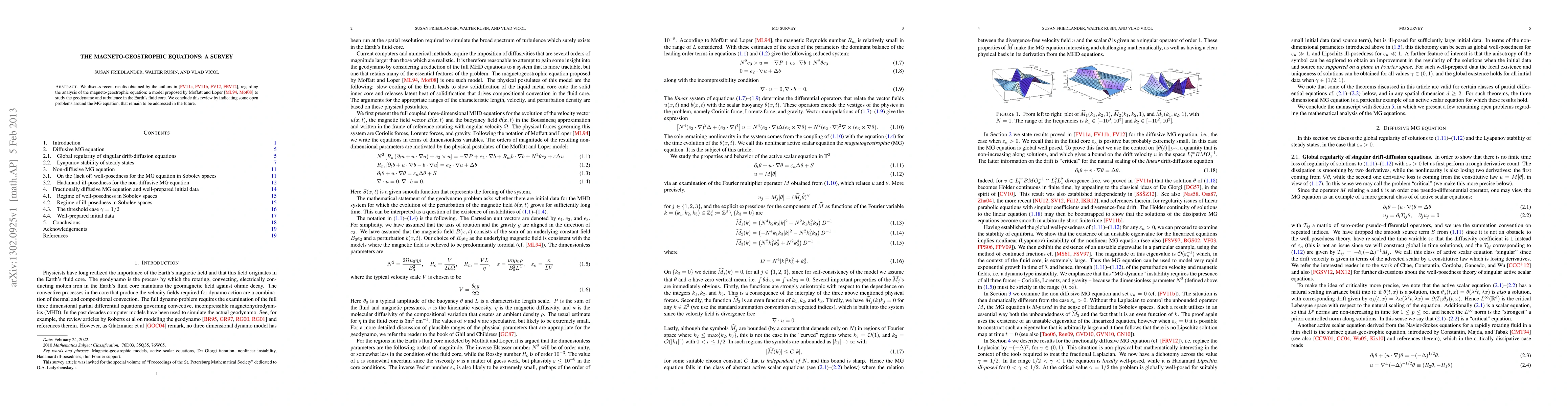 We discuss recent results obtained by the authors, regarding the analysis of the magneto-geostrophic equation: a model proposed by Moffat and Loper to study the geodynamo and turbulence in the Earth's fluid core. We conclude this review by indicating some open problems around the MG equation, that remain to be addressed in the future.