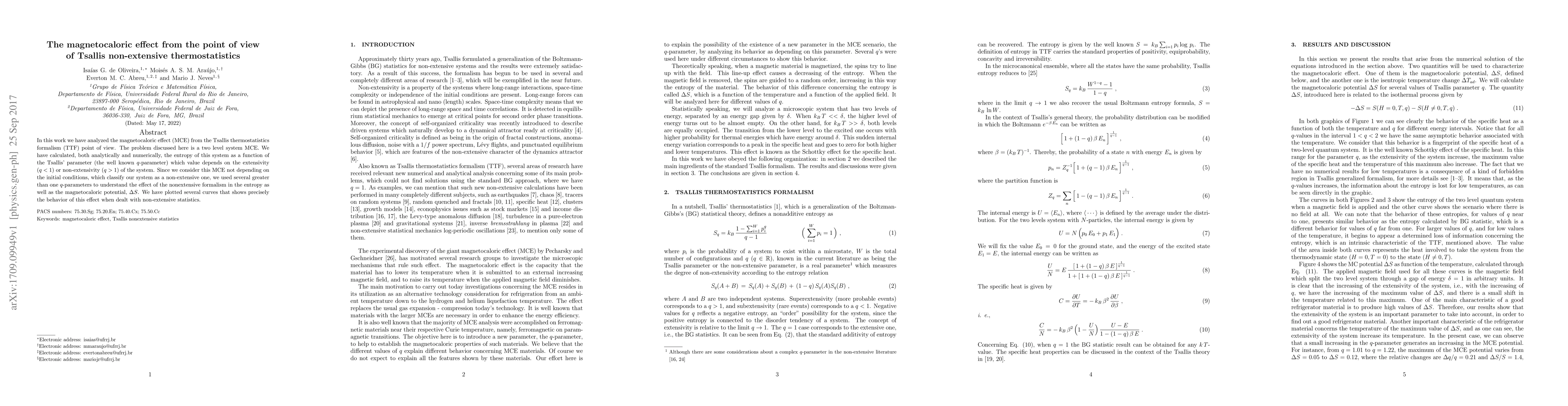This paper analyzes the magnetocaloric effect (MCE) using Tsallis non-extensive thermostatistics, focusing on a two-level system. It calculates the entropy and magnetocaloric potential $\Delta S$ as functions of the Tsallis parameter $q$, demonstrating the impact of non-extensivity on these quantities.