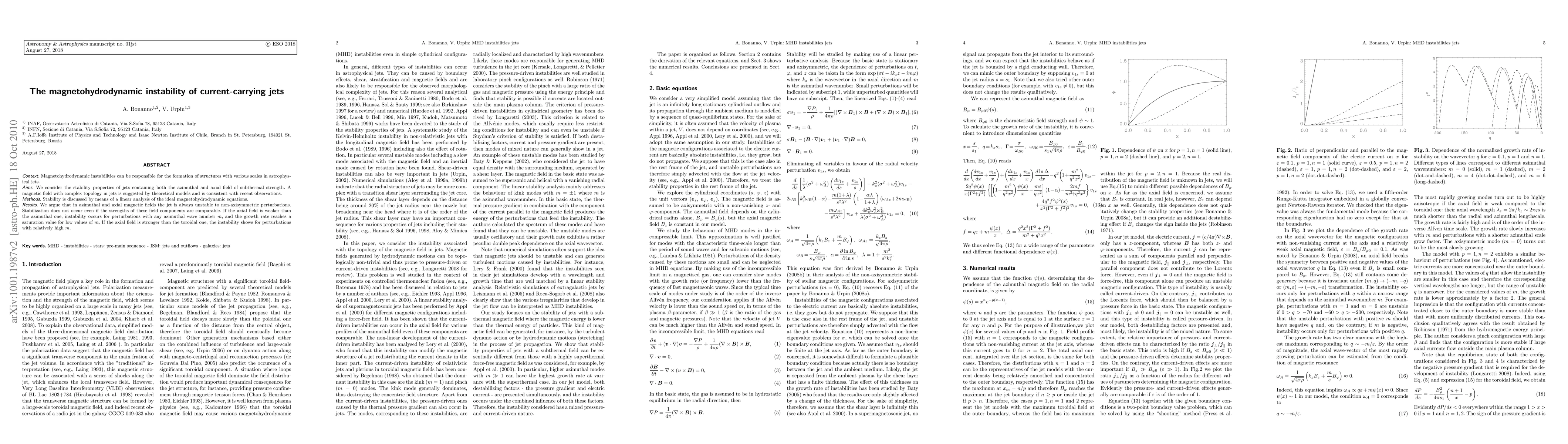 This paper investigates the magnetohydrodynamic instabilities in current-carrying jets, finding that jets with both azimuthal and axial magnetic fields are always unstable to non-axisymmetric perturbations. The growth rate of instability saturates for low azimuthal wave numbers when the axial field is weaker than the azimuthal one.