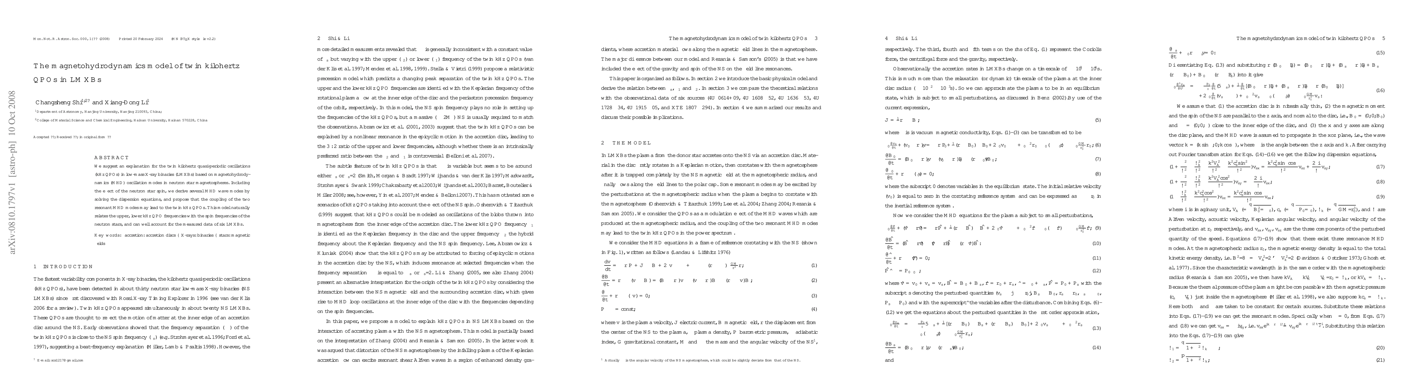 This paper proposes a magnetohydrodynamics model explaining twin kilohertz quasi-periodic oscillations (kHz QPOs) in low-mass X-ray binaries (LMXBs) through neutron star magnetosphere oscillations. The model suggests that the coupling of two resonant magnetohydrodynamics modes, influenced by neutron star spin, generates the twin kHz QPOs, aligning with observed data from six LMXBs.