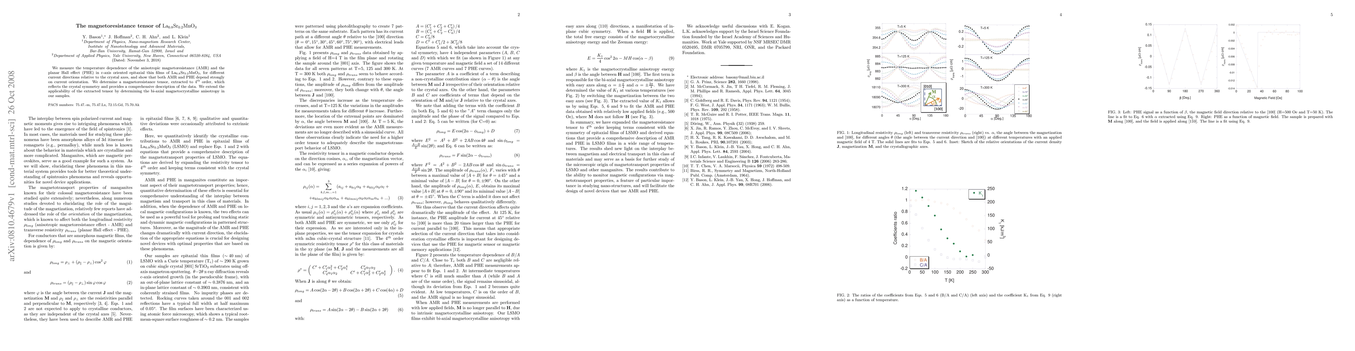 This study measures the temperature dependence of anisotropic magnetoresistance and planar Hall effect in La(0.8)Sr(0.2)MnO(3) thin films, revealing strong dependence on current orientation. A comprehensive magnetoresistance tensor, extracted to 4th order, reflects the crystal symmetry and describes the data, while also determining the bi-axial magnetocrystalline anisotropy.