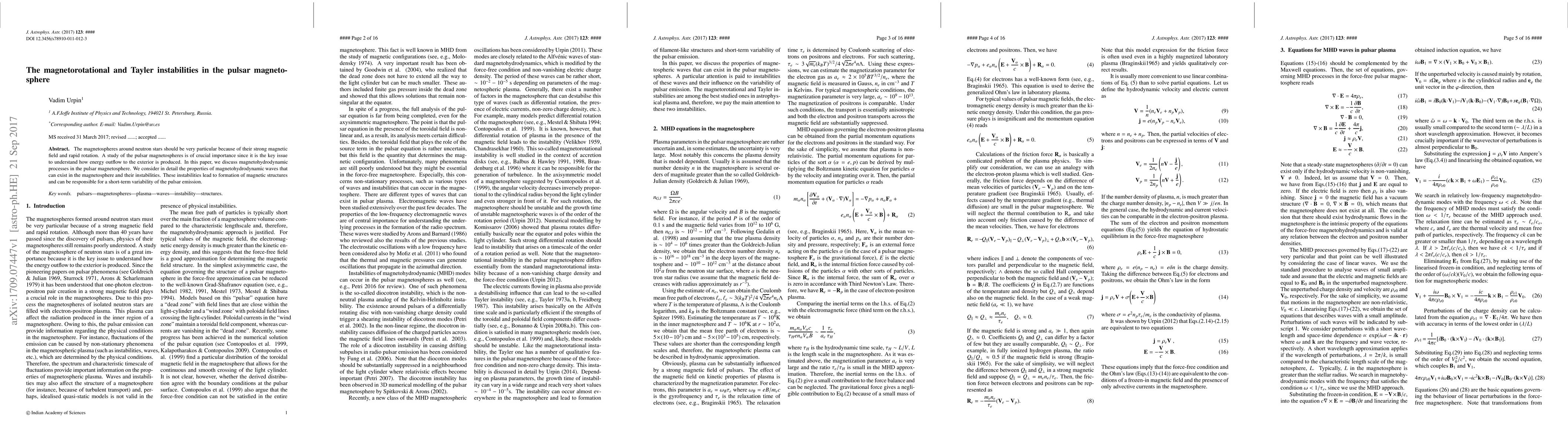 This paper investigates magnetohydrodynamic processes in pulsar magnetospheres, focusing on magnetorotational and Tayler instabilities that can generate magnetic structures and contribute to short-term variability in pulsar emissions. Understanding these instabilities is crucial for comprehending energy inflow mechanisms in neutron star magnetospheres.