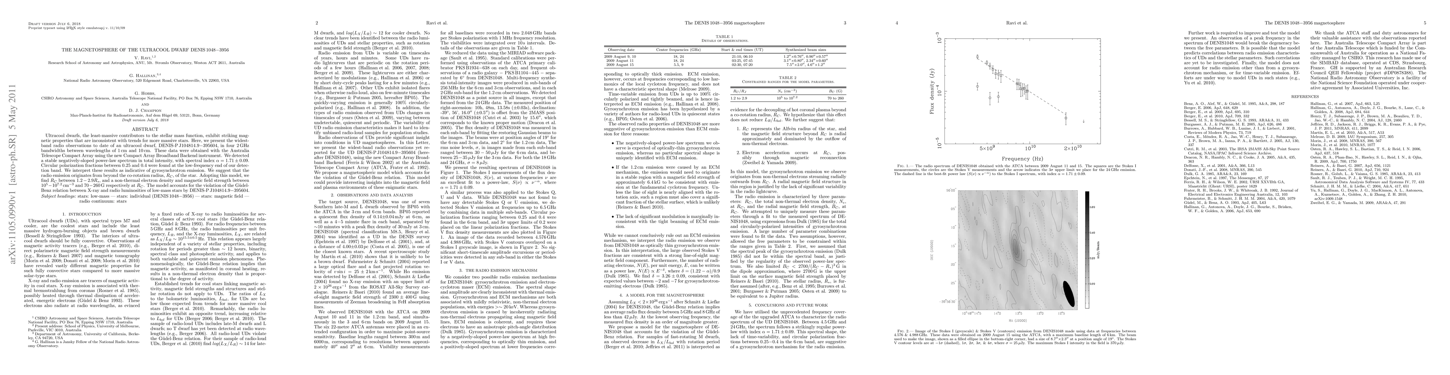 Ultracool dwarfs, the least-massive contributors to the stellar mass function, exhibit striking magnetic properties that are inconsistent with trends for more massive stars. Here, we present the widest-band radio observations to date of an ultracool dwarf, DENIS-P J104814.9-395604, in four 2 GHz bandwidths between wavelengths of 1 cm and 10 cm. These data were obtained with the Australia Telescope Compact Array using the new Compact Array Broadband Backend instrument. We detected a stable negatively-sloped power-law spectrum in total intensity, with spectral index alpha=1.71+-0.09. Circular polarization fractions between 0.25 and 0.4 were found at the low-frequency end of our detection band. We interpret these results as indicative of gyrosynchrotron emission. We suggest that the radio emission originates from beyond the co-rotation radius, R_C, of the star. Adopting this model, we find R_C between 1.2-2.9 R_*, and a non-thermal electron density and magnetic field strength between 10^(5)-10^(7.2) cm^(-3) and 70-260 G respectively at R_C. The model accounts for the violation of the Guedel-Benz relation between X-ray and radio luminosities of low-mass stars by DENIS-P J104814.9-395604.
