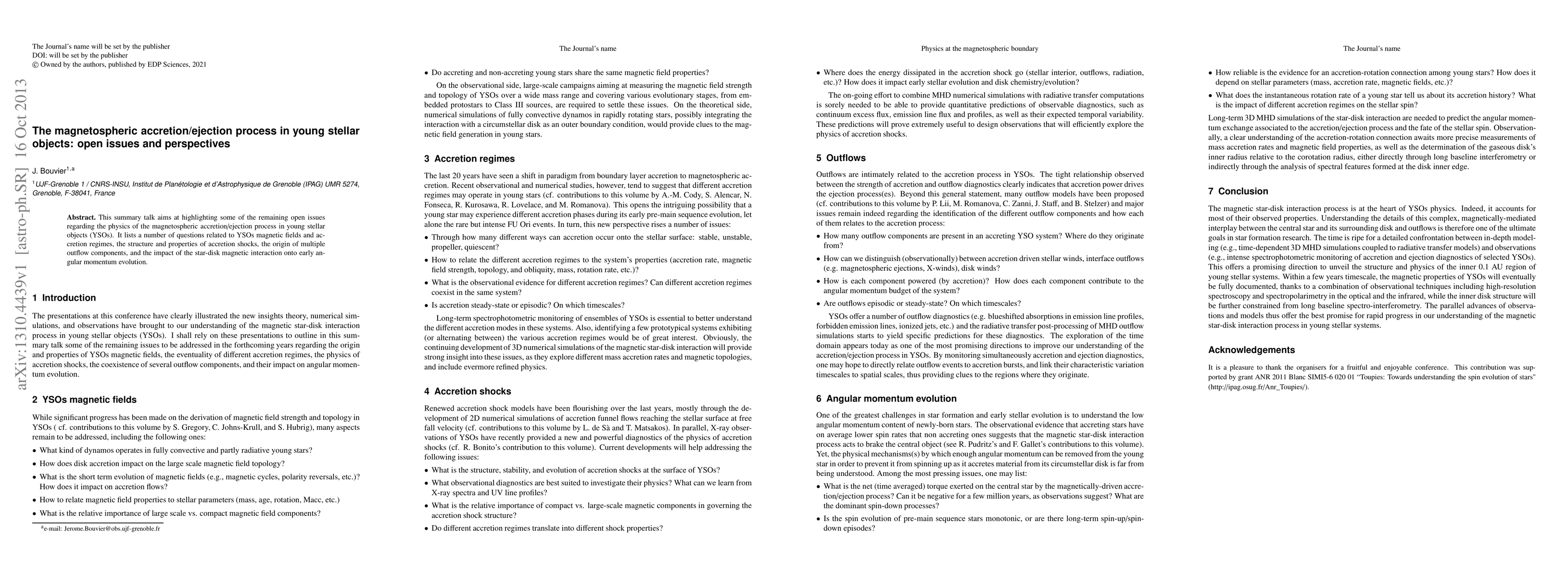 This paper discusses unresolved issues in the magnetospheric accretion/ejection processes in young stellar objects, focusing on magnetic fields, accretion shocks, outflow components, and the influence of star-disk magnetic interactions on angular momentum evolution.