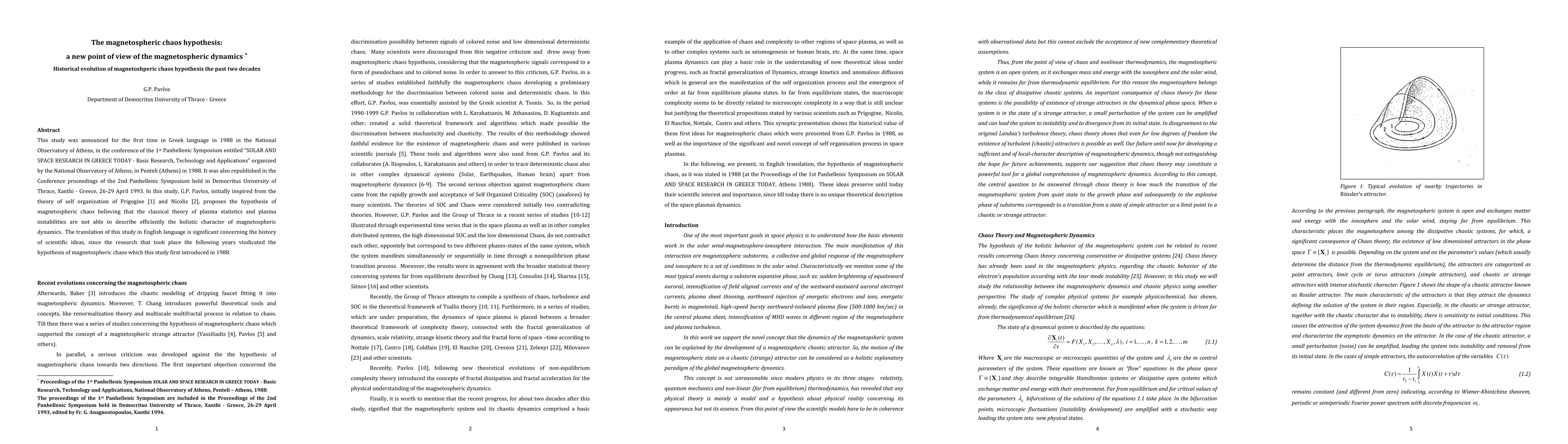 This study was announced for the first time in Greek language in 1988 in the National Observatory of Athens, in the conference of the 1st Panhellenic Symposium entitled "Solar and Space Research in Greece Today - Basic Research, Technology and Applications" organized by the National Observatory of Athens, in Penteli (Athens) in 1988. It was also republished in the Conference proceedings of the 2nd Panhellenic Symposium held in Democritus University of Thrace, Xanthi - Greece, 26-29 April 1993. In this study, G.P. Pavlos, initially inspired from the theory of self organization of Prigogine [1] and Nicolis [2], proposes the hypothesis of magnetospheric chaos believing that the classical theory of plasma statistics and plasma instabilities are not able to describe efficiently the holistic character of magnetospheric dynamics. The translation of this study in English language is significant concerning the history of scientific ideas, since the research that took place the following years vindicated the hypothesis of magnetospheric chaos which this study first introduced in 1988