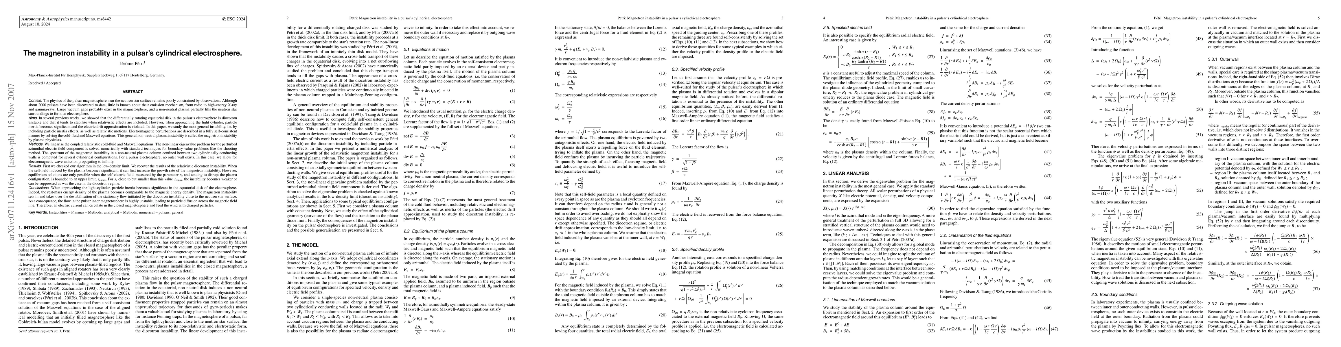 (abridged) The physics of the pulsar magnetosphere remains poorly constrained by observations. Little is known about their emission mechanism. Large vacuum gaps probably exist, and a non-neutral plasma partially fills the neutron star surroundings to form an electrosphere. We showed that the differentially rotating equatorial disk in the pulsar's electrosphere is diocotron unstable and that it tends to stabilise when relativistic effects are included. However, when approaching the light cylinder, particle inertia becomes significant and the electric drift approximation is violated. In this paper, we study the most general instability, i.e. by including particle inertia effects, as well as relativistic motions. This general non-neutral plasma instability is called the magnetron instability. We linearise the coupled relativistic cold-fluid and Maxwell equations. The non-linear eigenvalue problem for the perturbed azimuthal electric field component is solved numerically. The spectrum of the magnetron instability in a non-neutral plasma column confined between two cylindrically conducting walls is computed for several cylindrical configurations. For a pulsar electrosphere, no outer wall exists. In this case, we allow for electromagnetic wave emission propagating to infinity. When the self-field induced by the plasma becomes significant, it can first increase the growth rate of the magnetron instability. However, equilibrium solutions are only possible when the self-electric field, measured by the parameter $s_{\rm e}$ and tending to disrupt the plasma configuration, is bounded to an upper limit, $s_{\rm e,max}$. For $s_{\rm e}$ close to but smaller than this value $s_{\rm e,max}$, the instability becomes weaker or can be suppressed as was the case in the diocotron regime.
