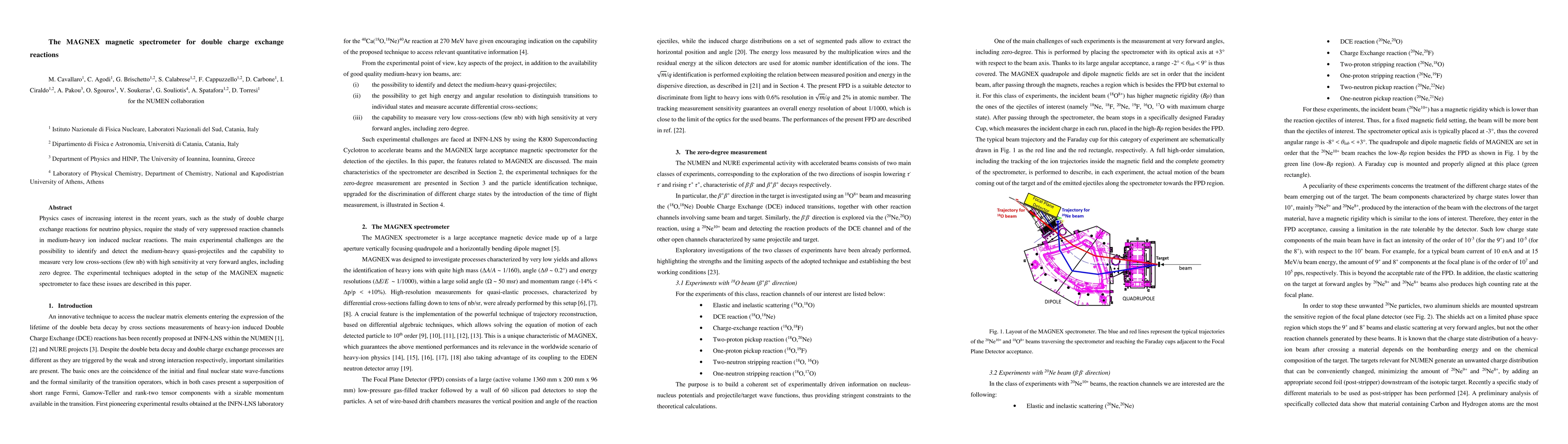 The MAGNEX magnetic spectrometer is designed to study double charge exchange reactions, crucial for neutrino physics, by detecting suppressed reaction channels in medium-heavy ion induced nuclear reactions with high sensitivity at very forward angles. The setup addresses the challenges of identifying medium-heavy quasi-projectiles and measuring very low cross-sections.