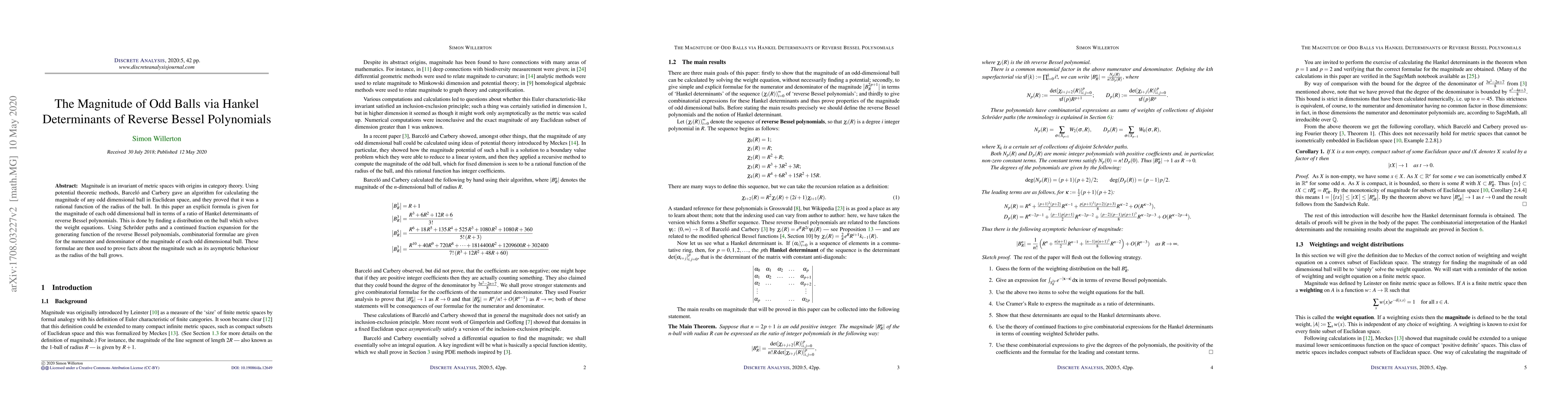 Magnitude is an invariant of metric spaces with origins in category theory. Using potential theoretic methods, Barcel\'o and Carbery gave an algorithm for calculating the magnitude of any odd dimensional ball in Euclidean space, and they proved that it was a rational function of the radius of the ball. In this paper an explicit formula is given for the magnitude of each odd dimensional ball in terms of a ratio of Hankel determinants of reverse Bessel polynomials. This is done by finding a distribution on the ball which solves the weight equations. Using Schr\"oder paths and a continued fraction expansion for the generating function of the reverse Bessel polynomials, combinatorial formulae are given for the numerator and denominator of the magnitude of each odd dimensional ball. These formulae are then used to prove facts about the magnitude such as its asymptotic behaviour as the radius of the ball grows.