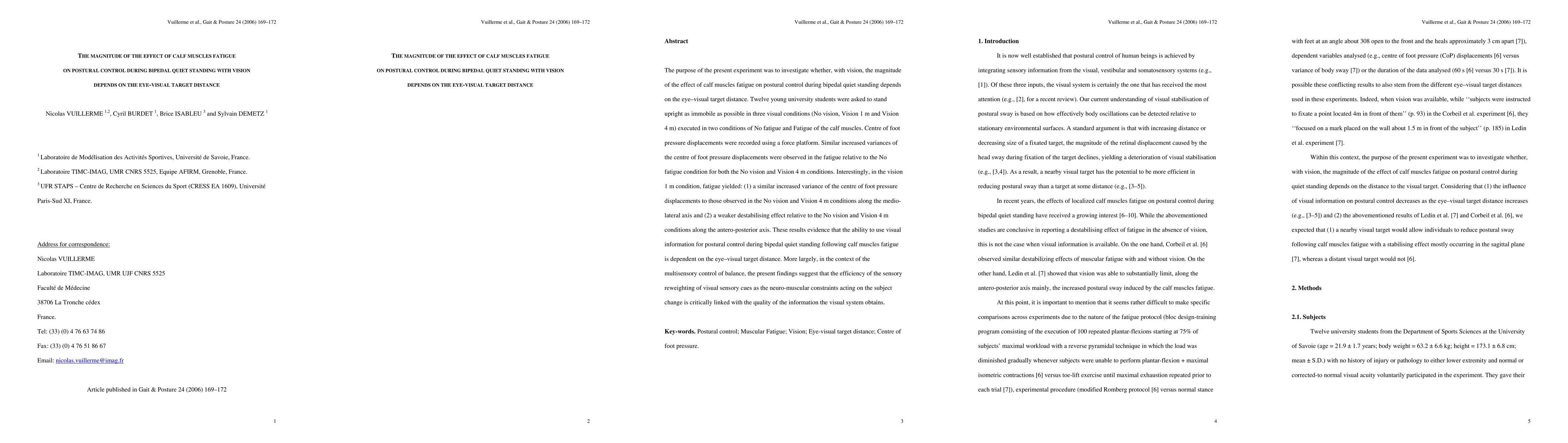 This study investigates the effect of calf muscle fatigue on postural control during bipedal standing under varying visual conditions and distances. Results show that fatigue increases postural instability, but the impact varies with the visual target distance, indicating that visual information quality influences sensory reweighting in balance control.