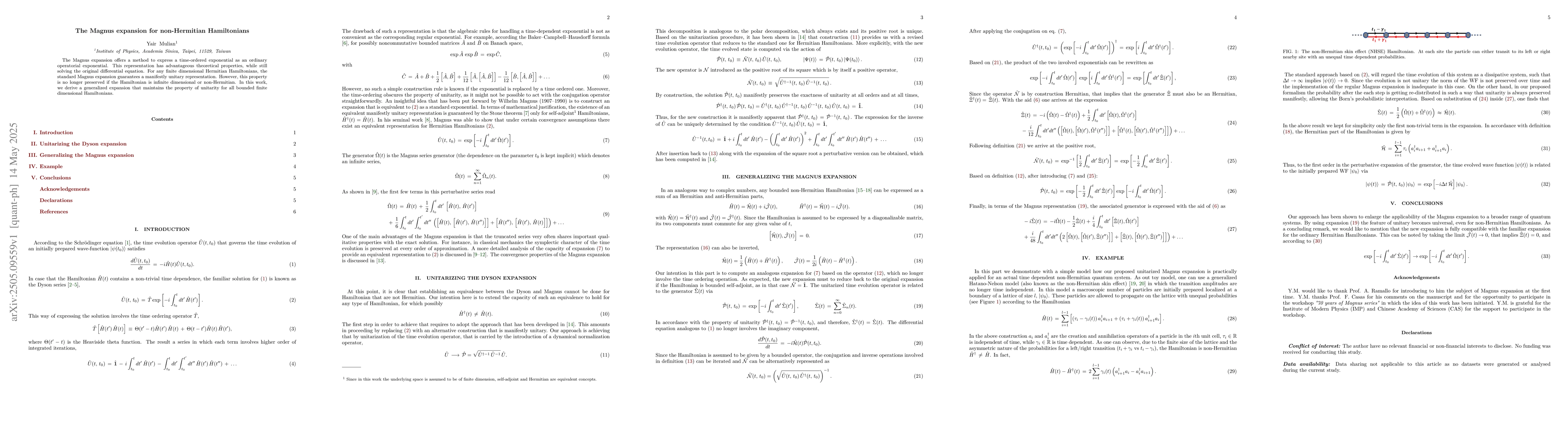 The paper derives a generalized Magnus expansion for non-Hermitian Hamiltonians, ensuring unitarity for bounded finite dimensional Hamiltonians.