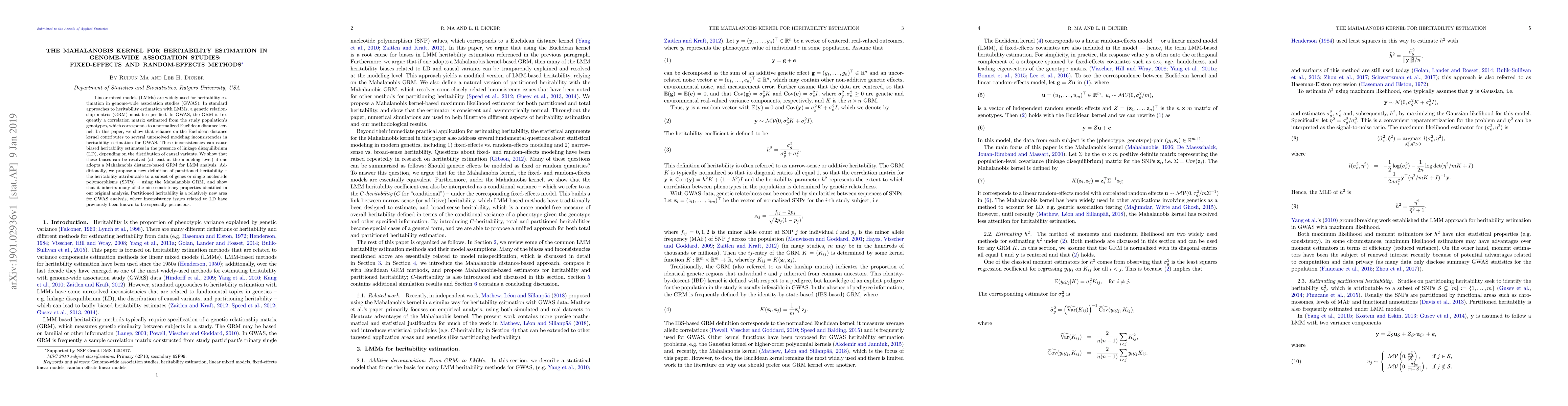 Linear mixed models (LMMs) are widely used for heritability estimation in genome-wide association studies (GWAS). In standard approaches to heritability estimation with LMMs, a genetic relationship matrix (GRM) must be specified. In GWAS, the GRM is frequently a correlation matrix estimated from the study population's genotypes, which corresponds to a normalized Euclidean distance kernel. In this paper, we show that reliance on the Euclidean distance kernel contributes to several unresolved modeling inconsistencies in heritability estimation for GWAS. These inconsistencies can cause biased heritability estimates in the presence of linkage disequilibrium (LD), depending on the distribution of causal variants. We show that these biases can be resolved (at least at the modeling level) if one adopts a Mahalanobis distance-based GRM for LMM analysis. Additionally, we propose a new definition of partitioned heritability -- the heritability attributable to a subset of genes or single nucleotide polymorphisms (SNPs) -- using the Mahalanobis GRM, and show that it inherits many of the nice consistency properties identified in our original analysis. Partitioned heritability is a relatively new area for GWAS analysis, where inconsistency issues related to LD have previously been known to be especially pernicious.