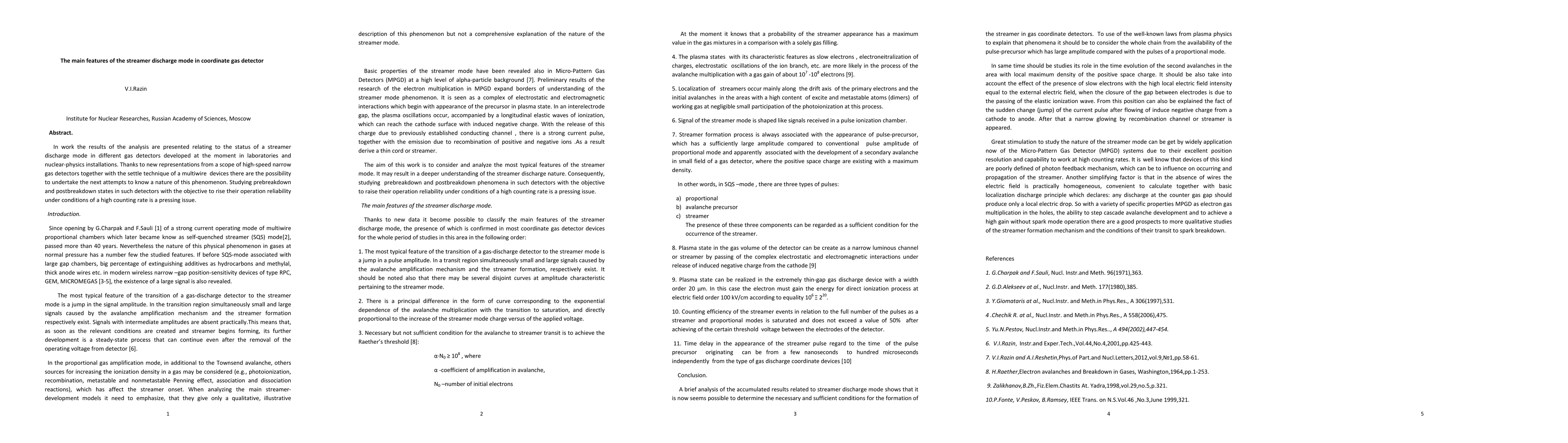 In work the results of the analysis are presented relating to the status of a streamer discharge mode in different gas detectors developed at the moment in laboratories and nuclear-physics installations. Thanks to new representations from a scope of high-speed narrow gas detectors together with the settle technique of a multiwire devices there are the possibility to undertake the next attempts to know a nature of this phenomenon. Studying prebreakdown and postbreakdown states in such detectors with the objective to rise their operation reliability under conditions of a high counting rate is a pressing issue.