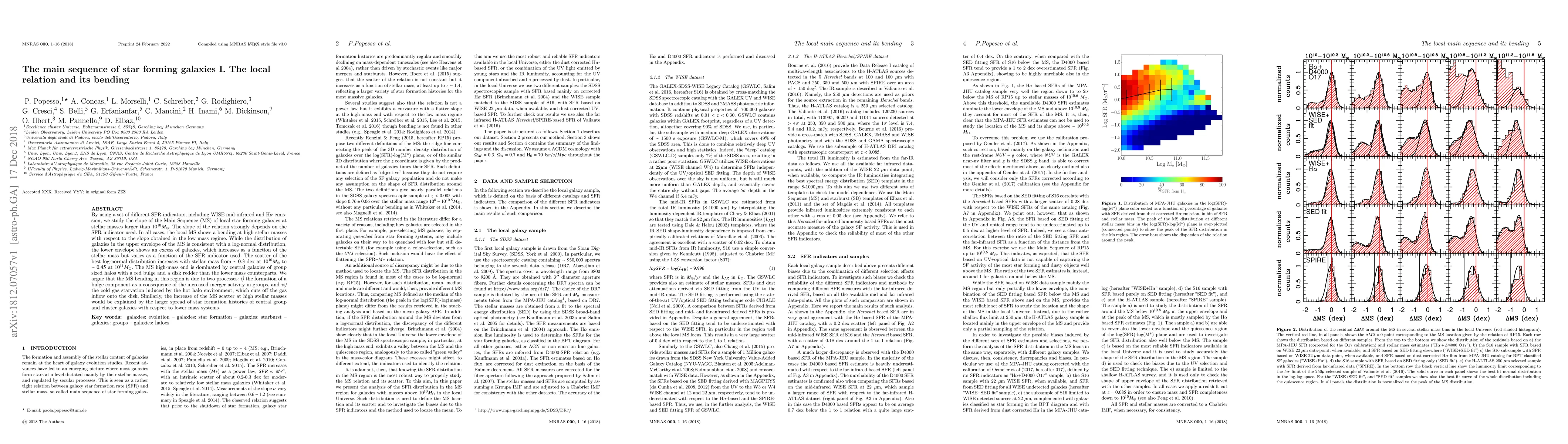 This paper investigates the Main Sequence (MS) of local star-forming galaxies, revealing a bending at high stellar masses due to increased merger activity and cold gas starvation in group-sized halos. The scatter in the MS increases with stellar mass, attributed to diverse star formation histories in central galaxies compared to lower mass systems.