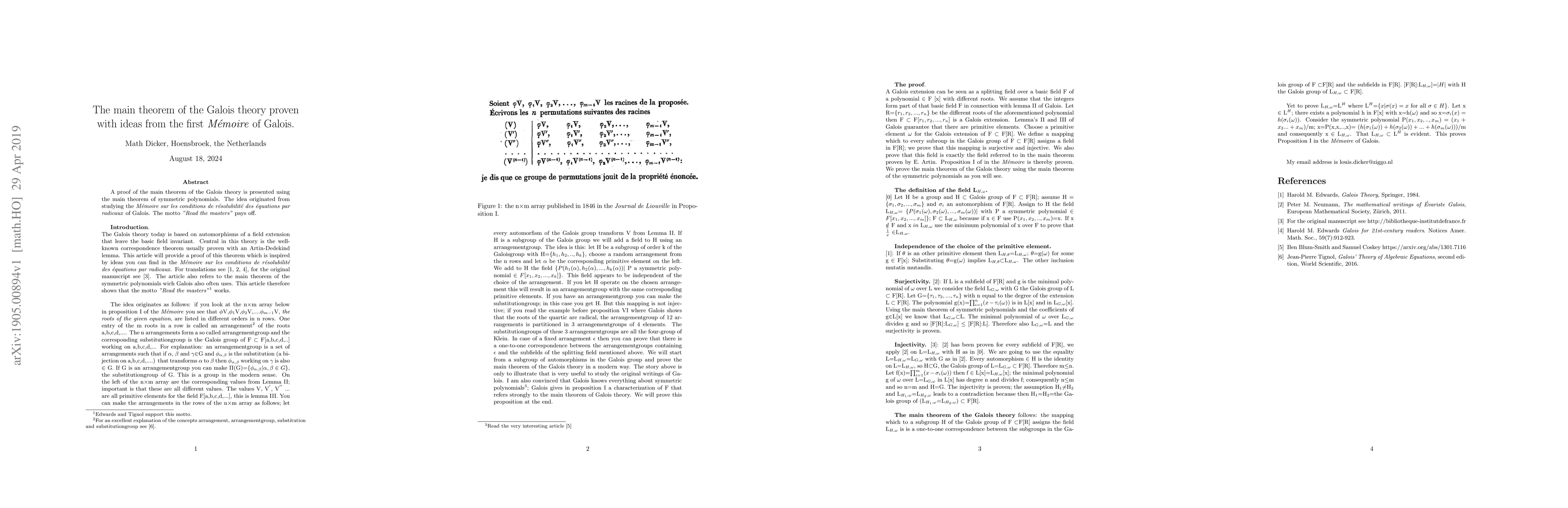 A proof of the main theorem of the Galois theory is presented using the main theorem of symmetric polynomials. The idea originated from studying the "M\'emoire sur les conditions de r\'esolubilit\'e des \'equations par radicaux" of Evariste Galois. The motto "Read the masters" pays off.