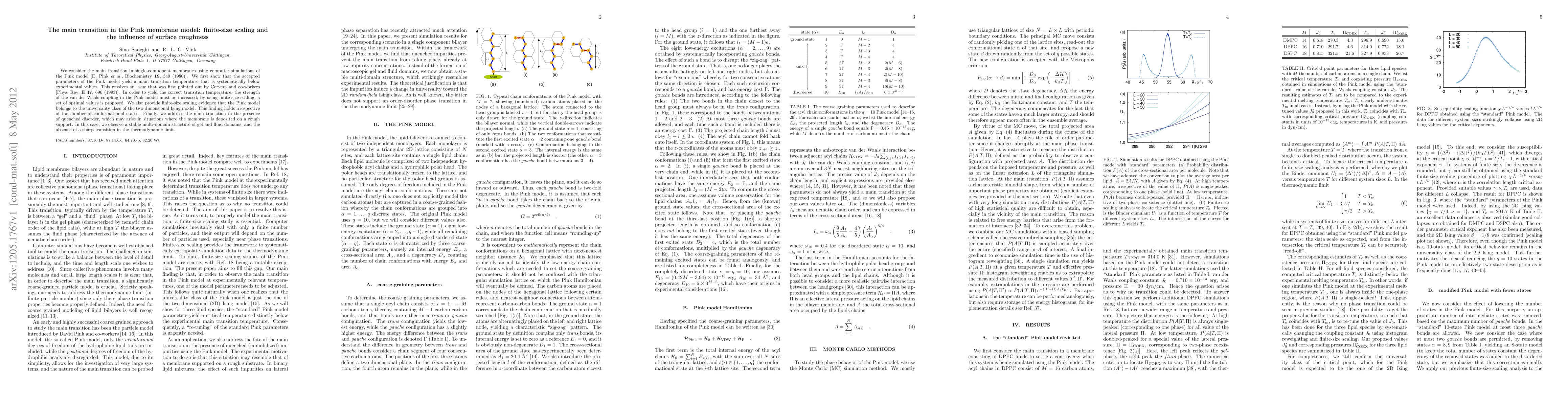 We consider the main transition in single-component membranes using computer simulations of the Pink model [D. Pink {\it et al.}, Biochemistry {\bf 19}, 349 (1980)]. We first show that the accepted parameters of the Pink model yield a main transition temperature that is systematically below experimental values. This resolves an issue that was first pointed out by Corvera and co-workers [Phys. Rev. E {\bf 47}, 696 (1993)]. In order to yield the correct transition temperature, the strength of the van der Waals coupling in the Pink model must be increased; by using finite-size scaling, a set of optimal values is proposed. We also provide finite-size scaling evidence that the Pink model belongs to the universality class of the two-dimensional Ising model. This finding holds irrespective of the number of conformational states. Finally, we address the main transition in the presence of quenched disorder, which may arise in situations where the membrane is deposited on a rough support. In this case, we observe a stable multi-domain structure of gel and fluid domains, and the absence of a sharp transition in the thermodynamic limit.