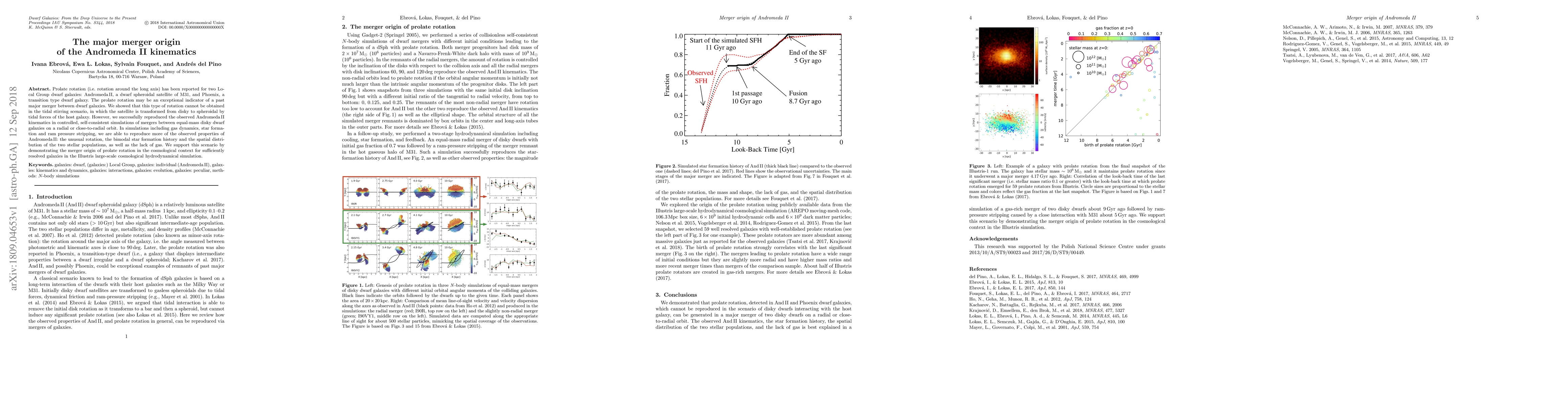This paper demonstrates that the prolate rotation of Andromeda II is likely the result of a major merger between equal-mass disky dwarf galaxies, rather than tidal stirring by its host galaxy M31. Simulations incorporating gas dynamics and star formation support this merger scenario, explaining Andromeda II's unique kinematics and star formation history.