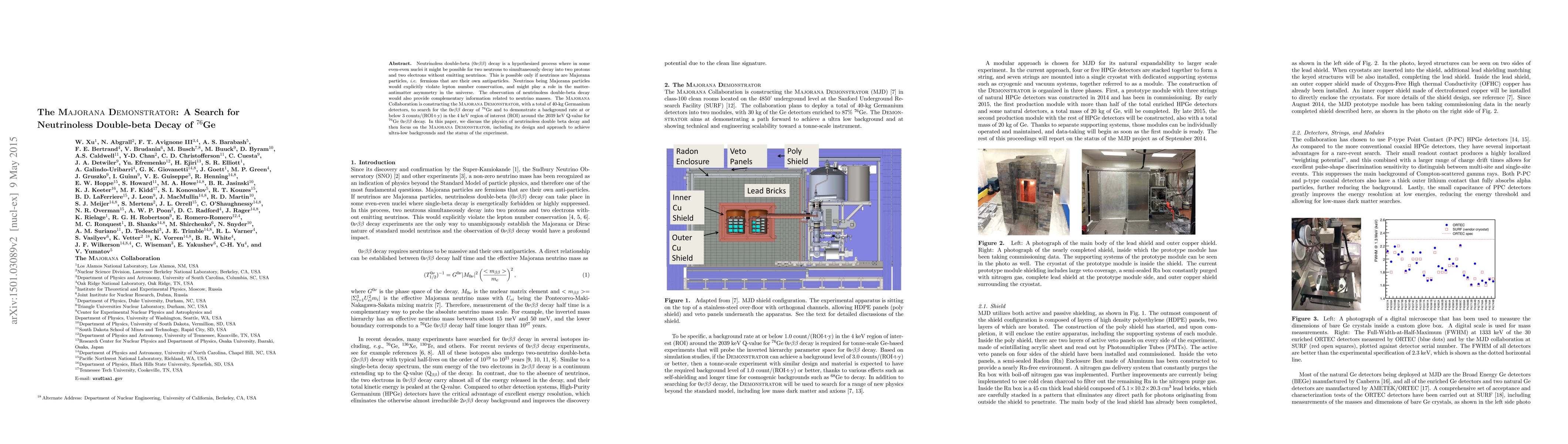 The Majorana Demonstrator aims to detect neutrinoless double-beta decay in 76Ge, a process that would indicate neutrinos are Majorana particles, violating lepton number conservation and potentially explaining the matter-antimatter asymmetry. The experiment employs a 40-kg germanium detector array to achieve an ultra-low background rate, crucial for observing this rare decay.