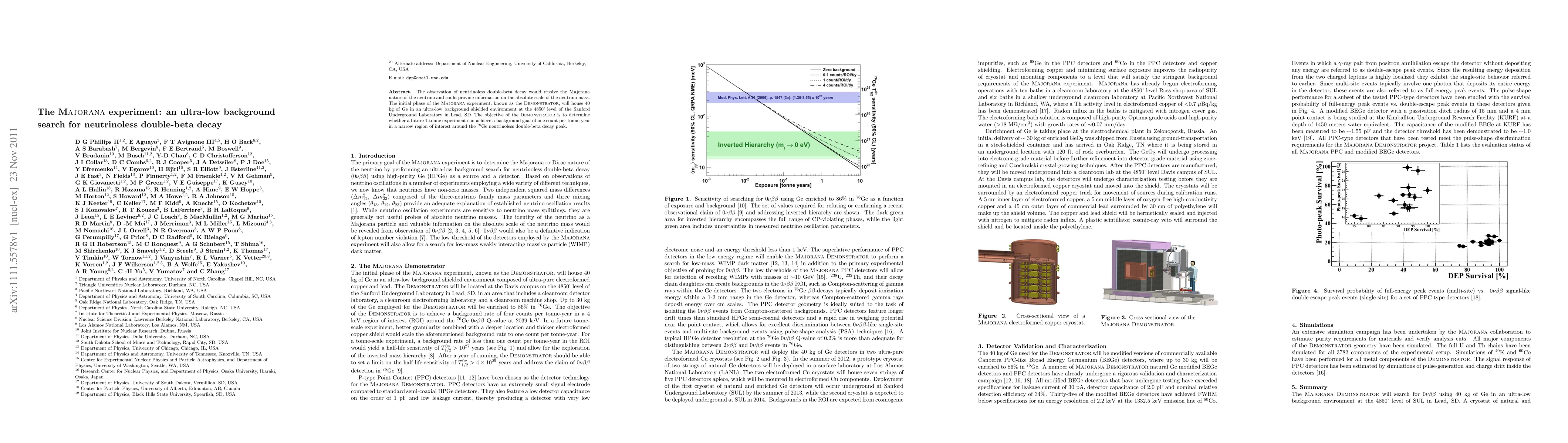 The Majorana experiment aims to detect neutrinoless double-beta decay, which would confirm the Majorana nature of neutrinos and reveal the absolute neutrino mass scale. The Demonstrator phase, housing 40 kg of Ge, seeks to verify if a future 1-tonne experiment can achieve a background rate of one count per tonne-year in the relevant energy region.