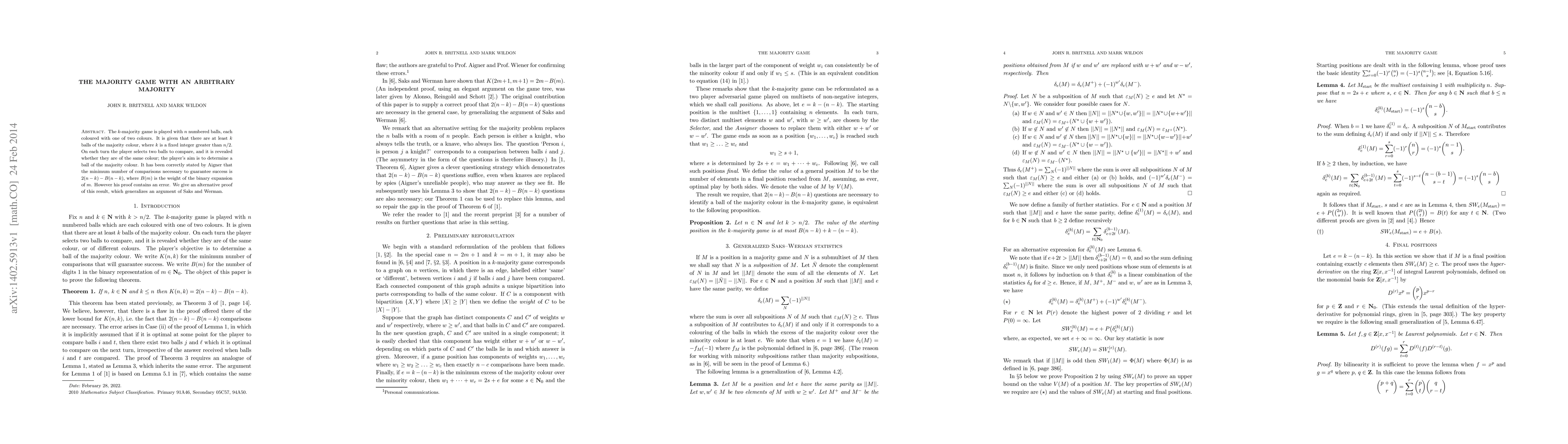 The $k$-majority game is played with $n$ numbered balls, each coloured with one of two colours. It is given that there are at least $k$ balls of the majority colour, where $k$ is a fixed integer greater than $n/2$. On each turn the player selects two balls to compare, and it is revealed whether they are of the same colour; the player's aim is to determine a ball of the majority colour. It has been correctly stated by Aigner that the minimum number of comparisons necessary to guarantee success is $2(n-k) - B(n-k)$, where $B(m)$ is the weight of the binary expansion of $m$. However his proof contains an error. We give an alternative proof of this result, which generalizes an argument of Saks and Werman.