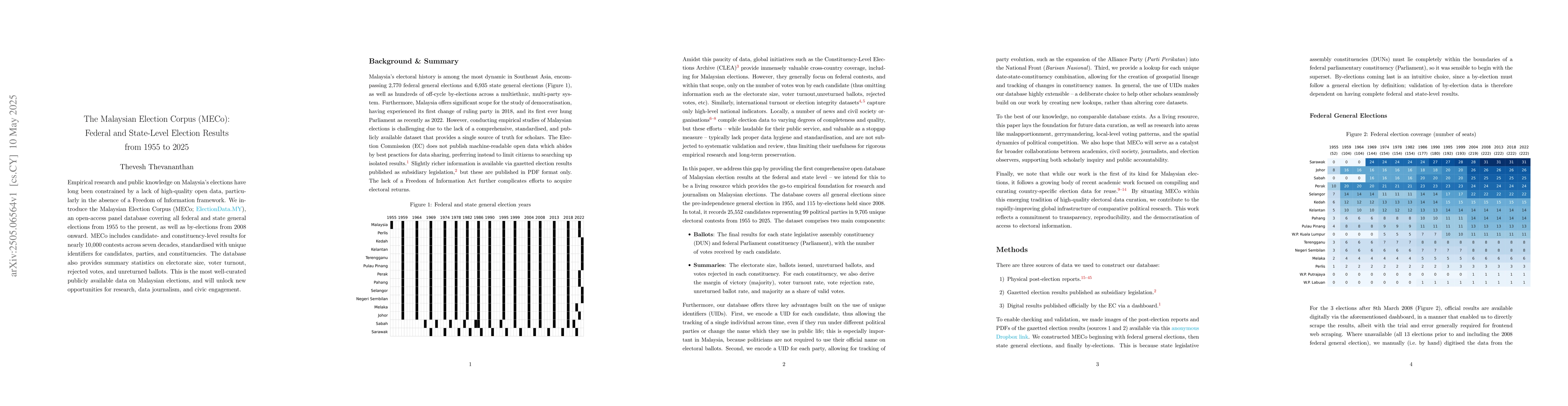 The paper introduces the Malaysian Election Corpus (MECo), an open-access panel database containing candidate- and constituency-level results for nearly 10,000 contests from 1955 to present, including by-elections from 2008. It standardizes data with unique identifiers for candidates, parties, and constituencies, and provides summary statistics on electoral aspects.