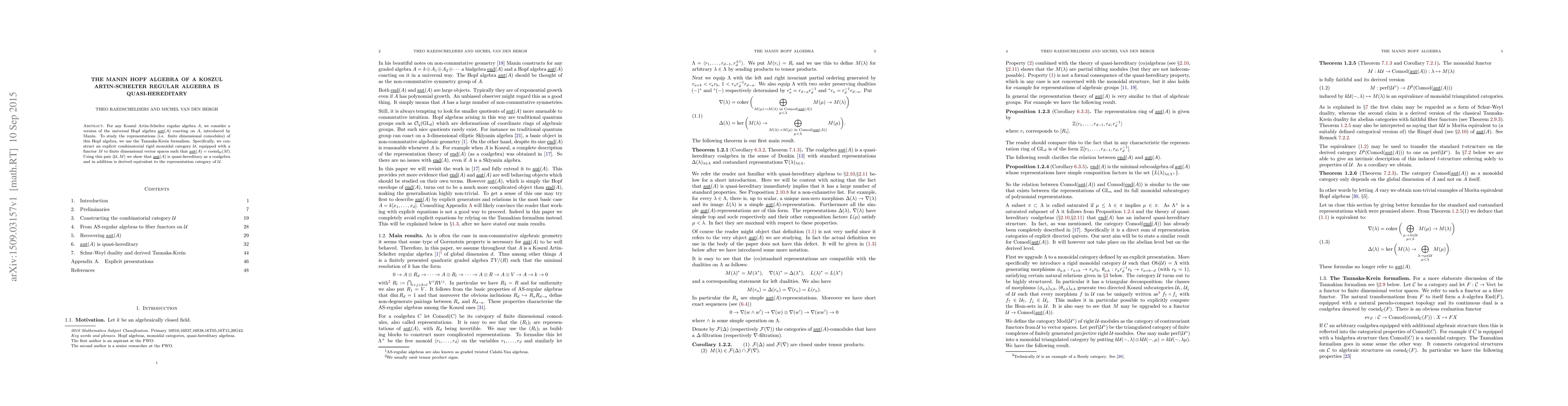 For any Koszul Artin-Schelter regular algebra A, we consider a version of the universal Hopf algebra aut(A) coacting on A, introduced by Manin. To study the representations (i.e. finite dimensional comodules) of this Hopf algebra, we use the Tannaka-Krein formalism. Specifically, we construct an explicit combinatorial rigid monoidal category U, equipped with a functor M to finite dimensional vector spaces such that aut(A)= coend_U(M). Using this pair (U,M) we show that aut(A) is quasi-hereditary as a coalgebra and in addition is derived equivalent to the representation category of U.