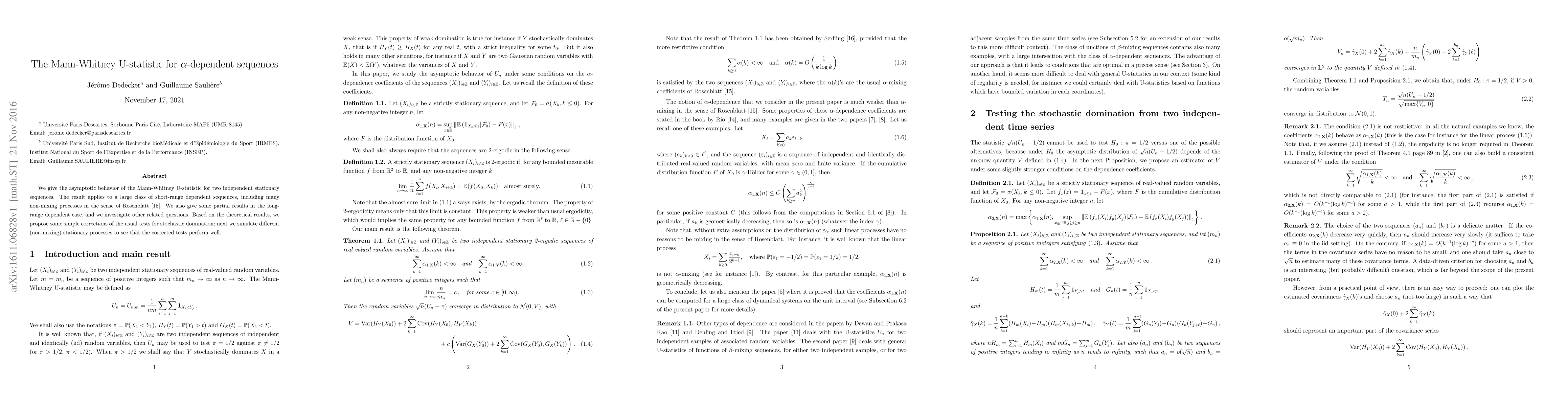This paper studies the asymptotic behavior of the Mann-Whitney U-statistic for two independent stationary sequences, extending results to short-range dependent sequences, including non-mixing processes. It also proposes simple corrections to usual tests for stochastic domination and validates these corrections through simulations of non-mixing stationary processes.