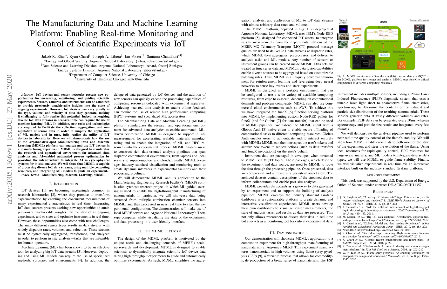 The paper discusses the Argonne-developed Manufacturing Data and Machine Learning (MDML) platform, which enables real-time monitoring and control of scientific experiments using IoT devices. The platform integrates diverse IoT data streams and leverages machine learning to optimize processes and enhance laboratory experiments.