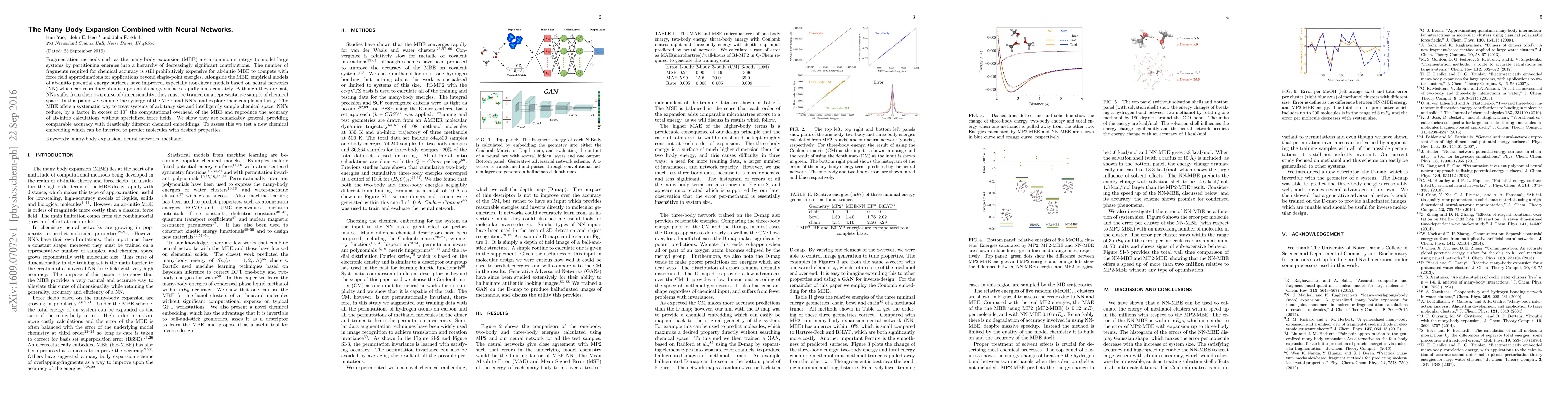 Fragmentation methods such as the many-body expansion (MBE) are a common strategy to model large systems by partitioning energies into a hierarchy of decreasingly significant contributions. The number of fragments required for chemical accuracy is still prohibitively expensive for ab-initio MBE to compete with force field approximations for applications beyond single-point energies. Alongside the MBE, empirical models of ab-initio potential energy surfaces have improved, especially non-linear models based on neural networks (NN) which can reproduce ab-initio potential energy surfaces rapidly and accurately. Although they are fast, NNs suffer from their own curse of dimensionality; they must be trained on a representative sample of chemical space. In this paper we examine the synergy of the MBE and NN's, and explore their complementarity. The MBE offers a systematic way to treat systems of arbitrary size and intelligently sample chemical space. NN's reduce, by a factor in excess of $10^6$ the computational overhead of the MBE and reproduce the accuracy of ab-initio calculations without specialized force fields. We show they are remarkably general, providing comparable accuracy with drastically different chemical embeddings. To assess this we test a new chemical embedding which can be inverted to predict molecules with desired properties.