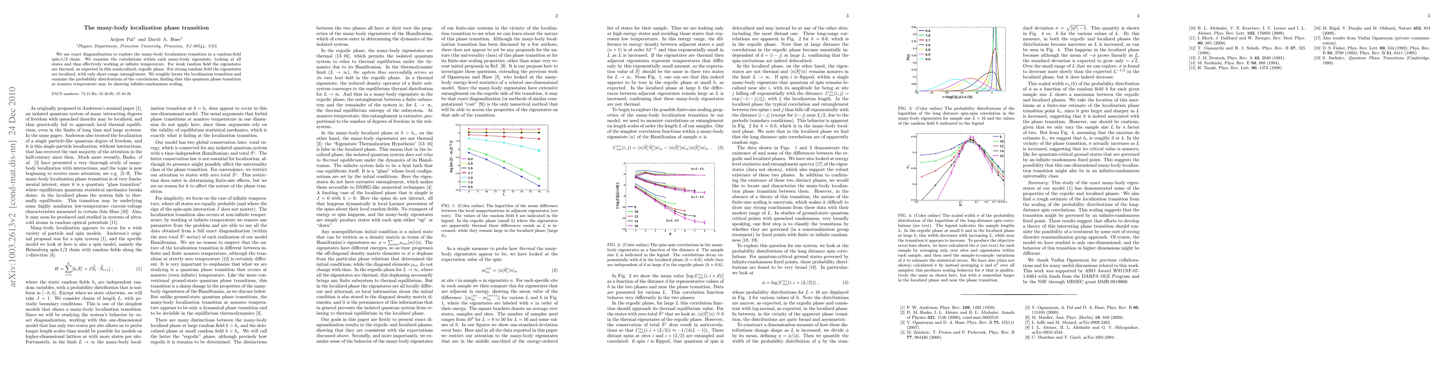 The paper explores the many-body localization transition in a random-field spin-1/2 chain using exact diagonalization. It finds thermal behavior with weak fields and localized states with short-range entanglement under strong fields, roughly identifying the transition point and suggesting infinite-randomness scaling at the quantum phase transition.