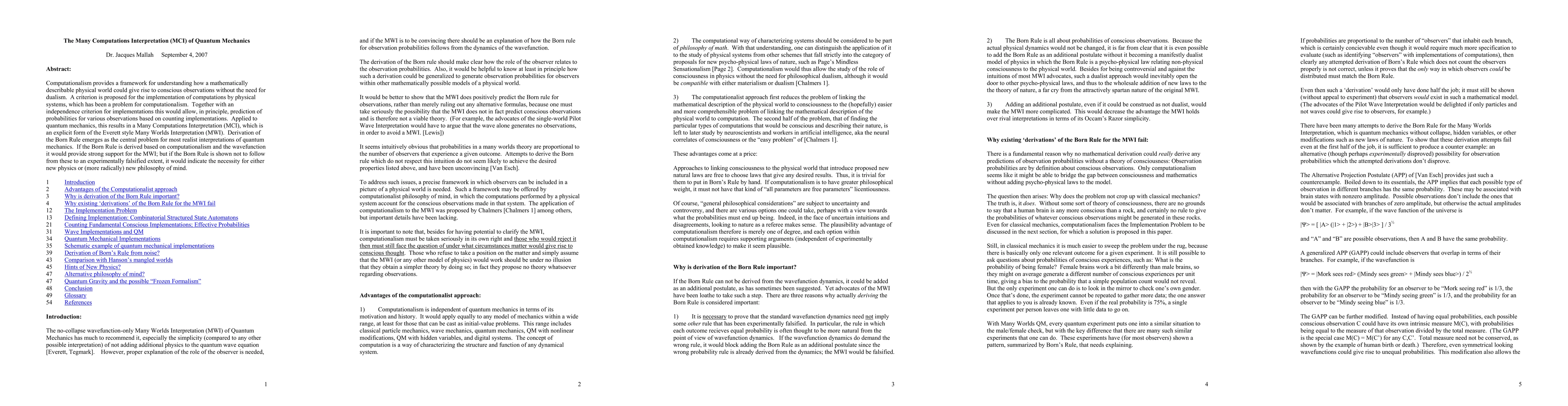 Computationalism provides a framework for understanding how a mathematically describable physical world could give rise to conscious observations without the need for dualism. A criterion is proposed for the implementation of computations by physical systems, which has been a problem for computationalism. Together with an independence criterion for implementations this would allow, in principle, prediction of probabilities for various observations based on counting implementations. Applied to quantum mechanics, this results in a Many Computations Interpretation (MCI), which is an explicit form of the Everett style Many Worlds Interpretation (MWI). Derivation of the Born Rule emerges as the central problem for most realist interpretations of quantum mechanics. If the Born Rule is derived based on computationalism and the wavefunction it would provide strong support for the MWI; but if the Born Rule is shown not to follow from these to an experimentally falsified extent, it would indicate the necessity for either new physics or (more radically) new philosophy of mind.