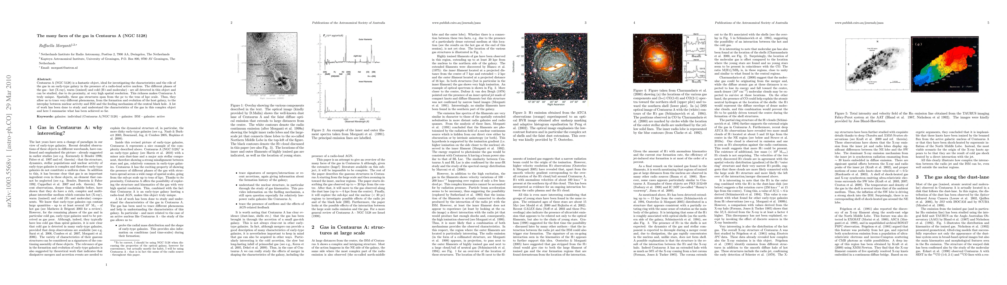 Centaurus A (NGC5128) is a fantastic object, ideal for investigating the characteristics and the role of the gas in an early-type galaxy in the presence of a radio-loud active nucleus. The different phases of the gas - hot (X-ray), warm (ionised) and cold (HI and molecular) - are all detected in this object and can be studied, due to its proximity, at very high spatial resolution. This richness makes Centaurus A truly unique. Spatially, these gas structures span from the pc to the tens of kpc scale. Thus, they allow us to trace very different phenomena, from the formation and evolution of the host galaxy, to the interplay between nuclear activity and ISM and the feeding mechanism of the central black hole. A lot of work has been done to study and understand the characteristics of the gas in this complex object and here I summarise what has been achieved so far.